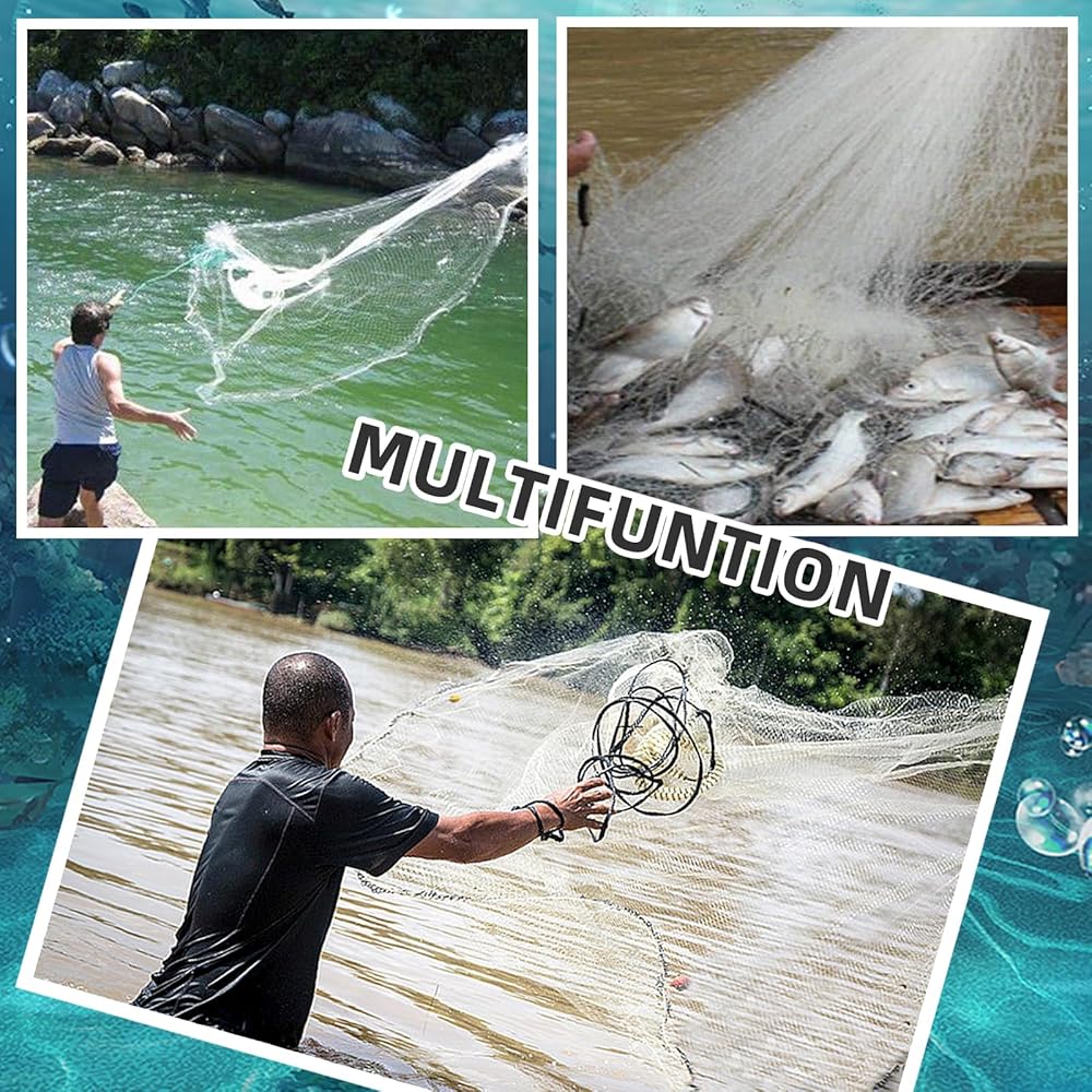 The package contains: 1. a fishing net & a thick rope, 2. a hexagonal fish cage & a thin rope & a floating ring. Easy to use: Fishing Cast Net: 1. Organize the hand strap and pick up the net to ensure that there are no tangled lines, 2. Pick up the bottom line of the net, one hand open 90° distance and grabbed a bottom line. (Can be placed in the direction you are used to), 3. Use the power of the rotation to throw the net to the target location, and further waters. Hexagonal Fish Cage: 1. Put bait into the bait bag inside the trap, 2. Close the zipper to the trap (special zipper design can help you easily take out the captured prey ), 3. Attach the hand rope, 4. Put the cage into the water and wait for the prey to enter the trap. Where to use: Whether it is a pond, a river, a shallow sea, etc., they will be so helpful in fishing.