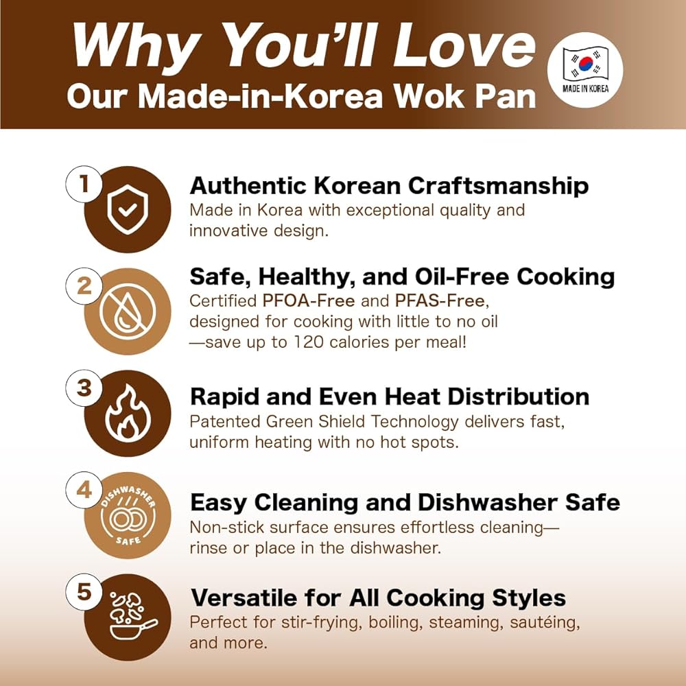 🍏 𝗟𝗢𝗢𝗞𝗜𝗡𝗚 𝗧𝗢 𝗘𝗠𝗕𝗥𝗔𝗖𝗘 𝗛𝗘𝗔𝗟𝗧𝗛𝗜𝗘𝗥 𝗖𝗢𝗢𝗞𝗜𝗡𝗚 𝗛𝗔𝗕𝗜𝗧𝗦? Our Woks & Stir-Fry Pans Nonstick are ingeniously engineered with Green Shield Technology, tailored for your well-being. Cook a lifetime without oil. Revel in its exceptional heat resistance, versatility across all induction surfaces, and free of PFOA. It's not just cookware; it's a commitment to convenient, health-focused cuisine.
