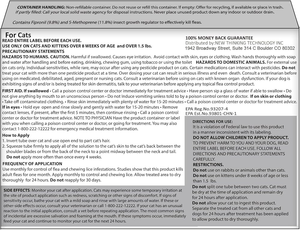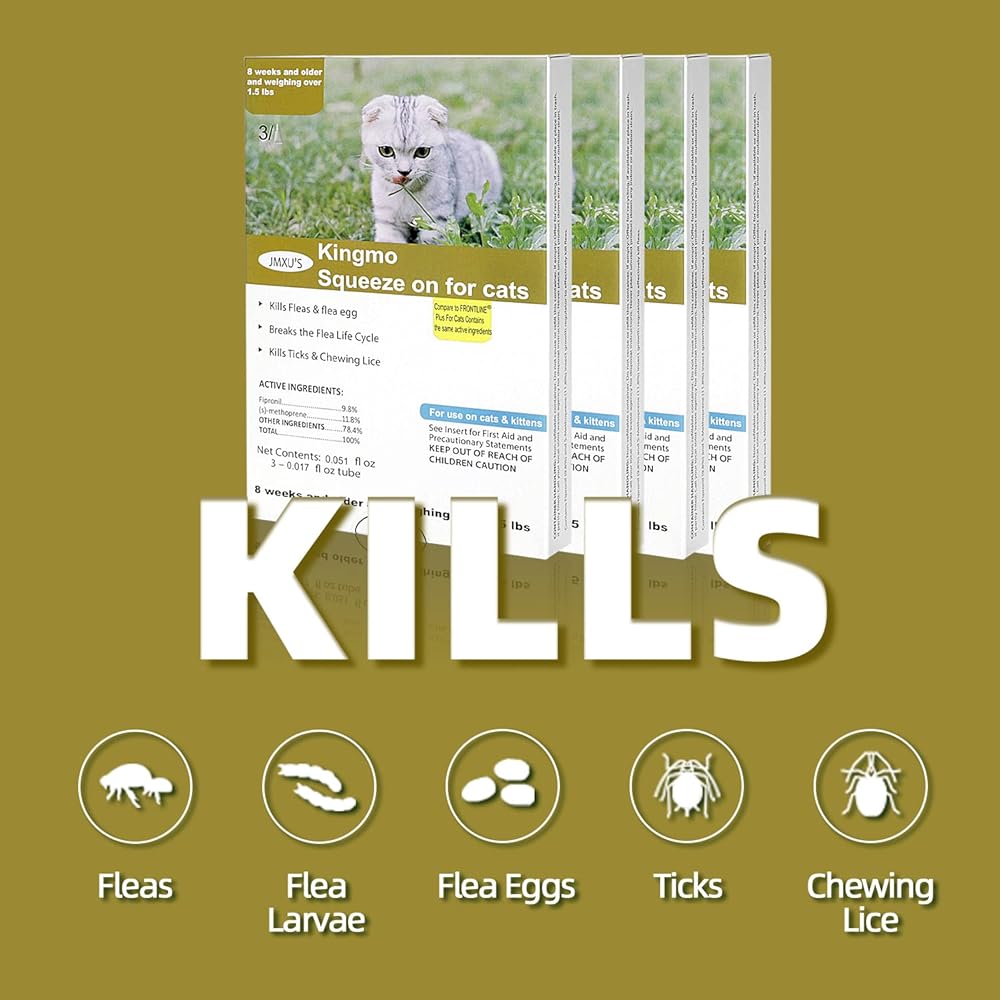 Flea and tick prevention for cats: Cat flea and tick treatment With waterproof, fast-acting, flea and tick topical prevention, suitable for cats( 8 weeks and older and weighing over 1.5 Ibs), 24 hours after use, your pet's treatment is protected from rain and water activities.