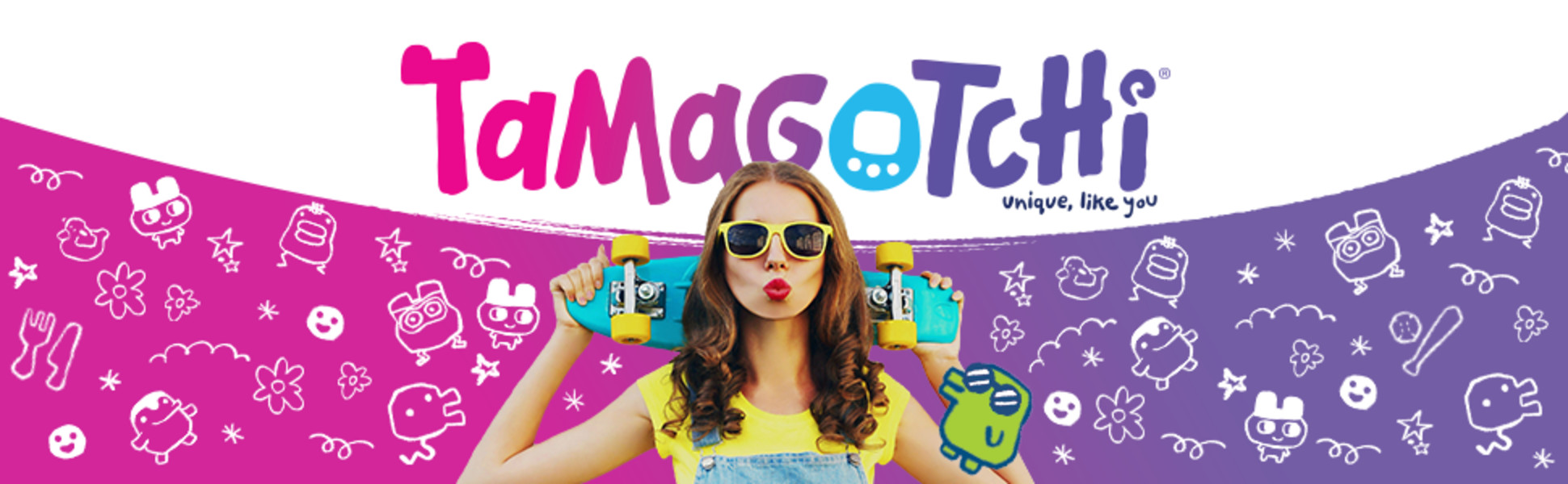 Candy swirl shell with black 'Tamagotchi' and buttons with white frame, original programming and characters, and updated logo