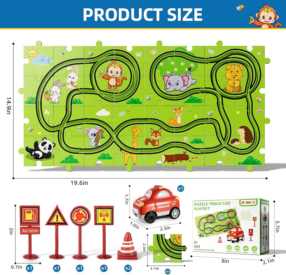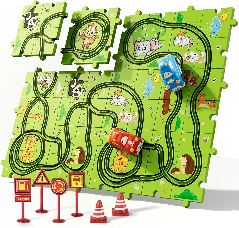 56 PCS Jigsaw Puzzle Race Tracks Car Toys For Kids Boys Toddlers - All kids like puzzles and cars! Our animal-themed kids puzzles race tracks car toys ages 2-4 3-5 4-6 include 48 PCS puzzles, 2 car and 6 traffic signs. Each jigsaw puzzle piece has a unique track and animal pattern. Starting this car trip requires 1 AA battery - not included. Suitable puzzle car tracks toys gifts for 2 3 4 5 6 year old boy kids toddlers.