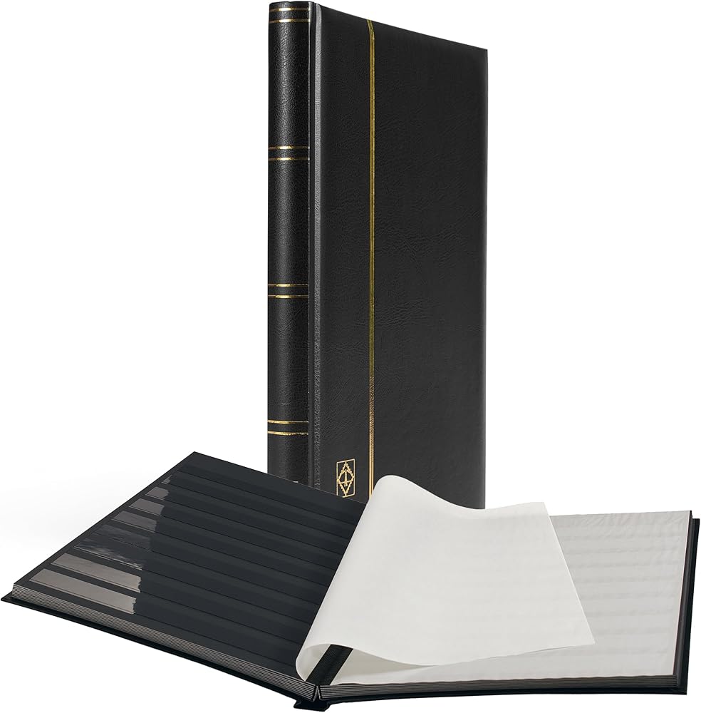 - Construction: Black cardboard, clear strips and glassine interleaves