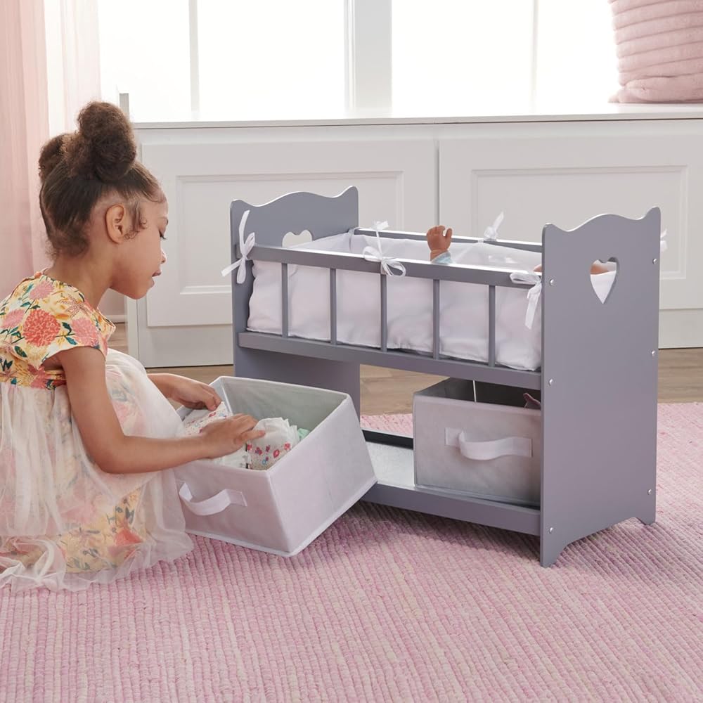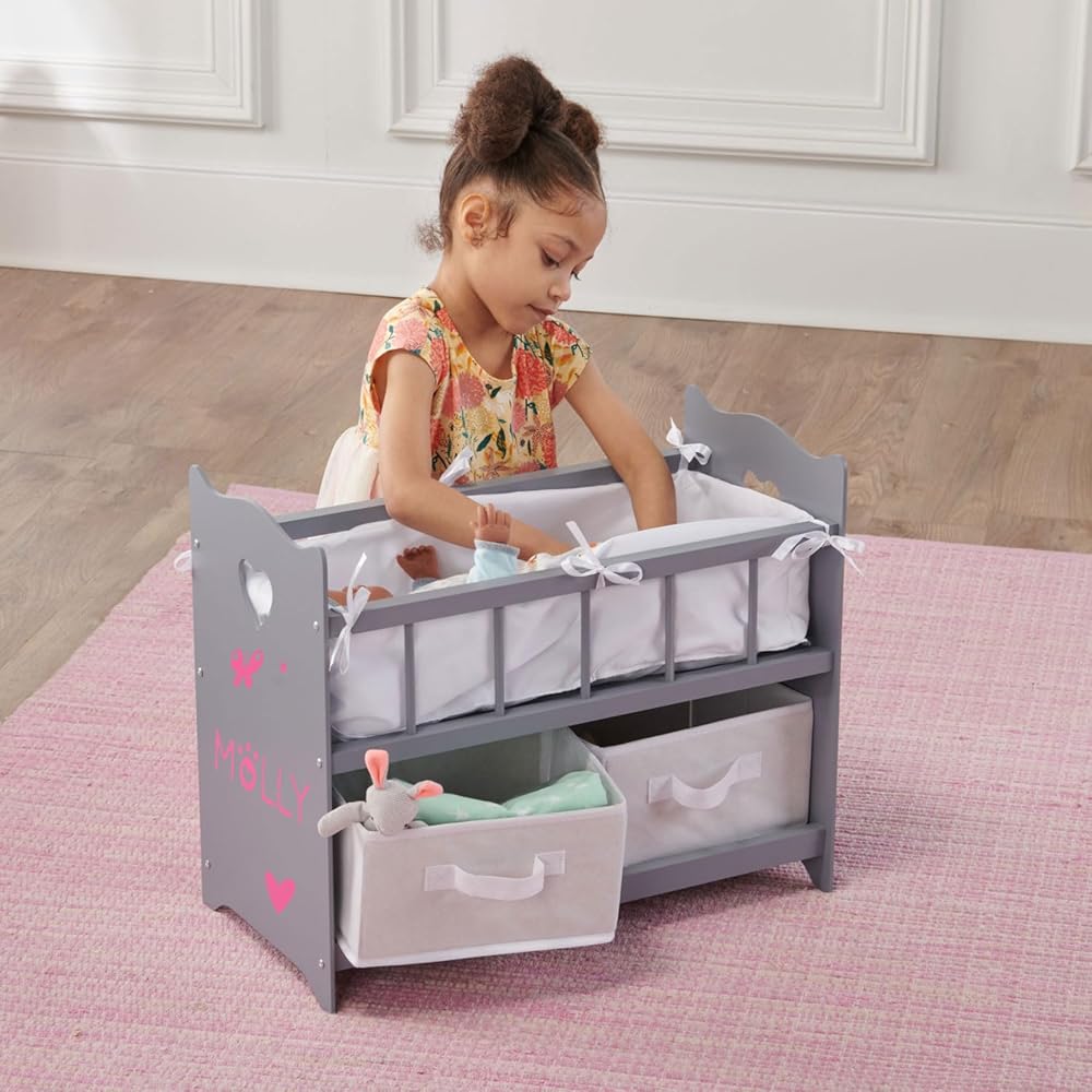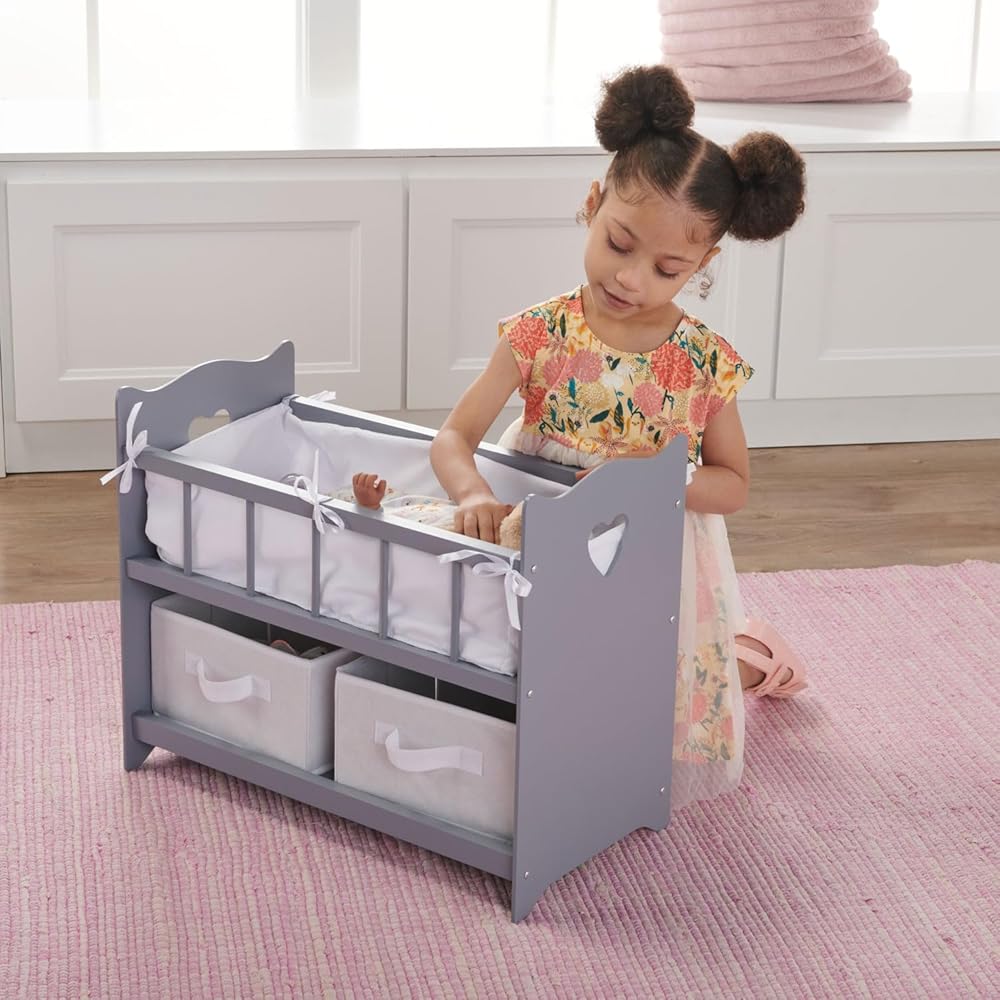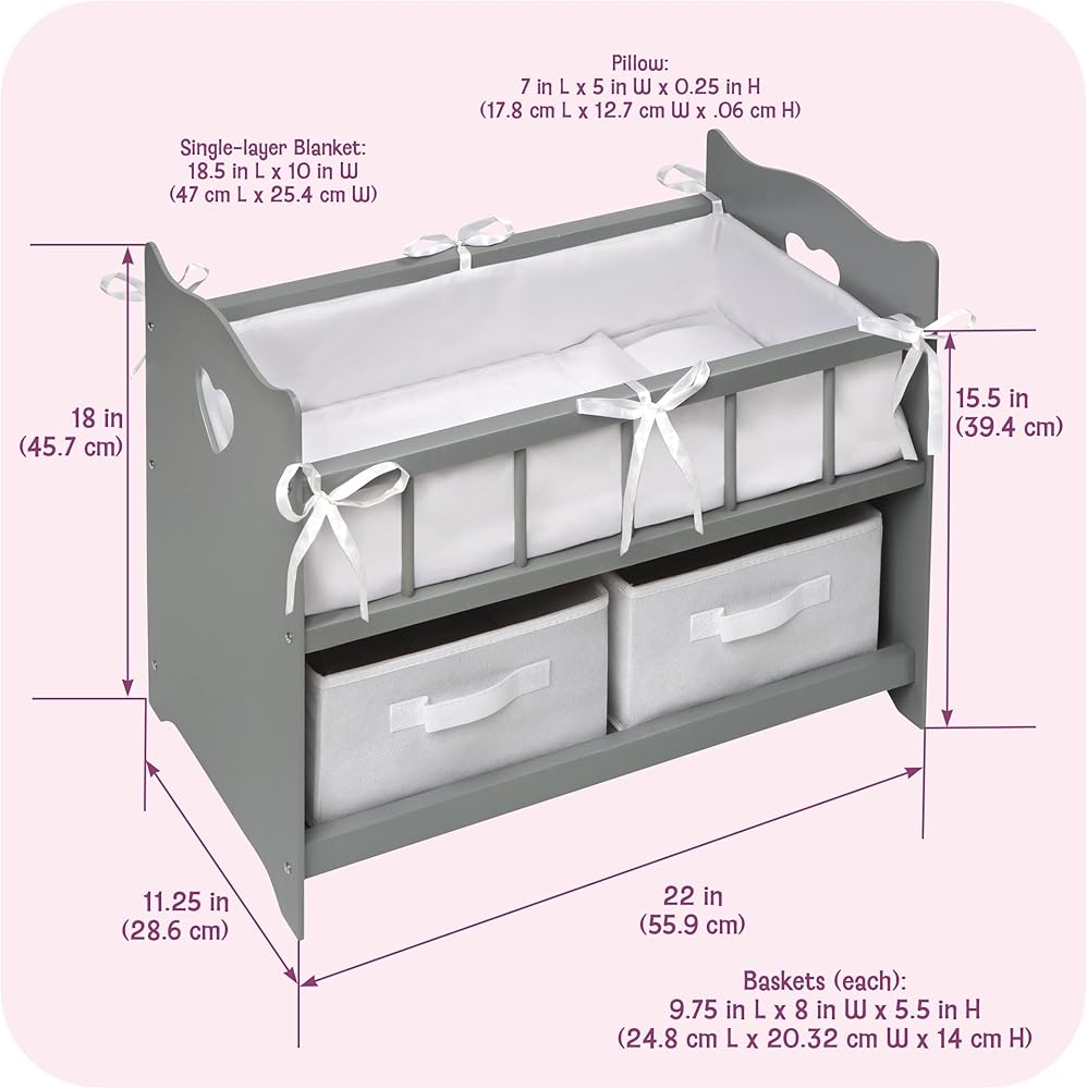 This sophisticated doll crib also includes two removable storage baskets