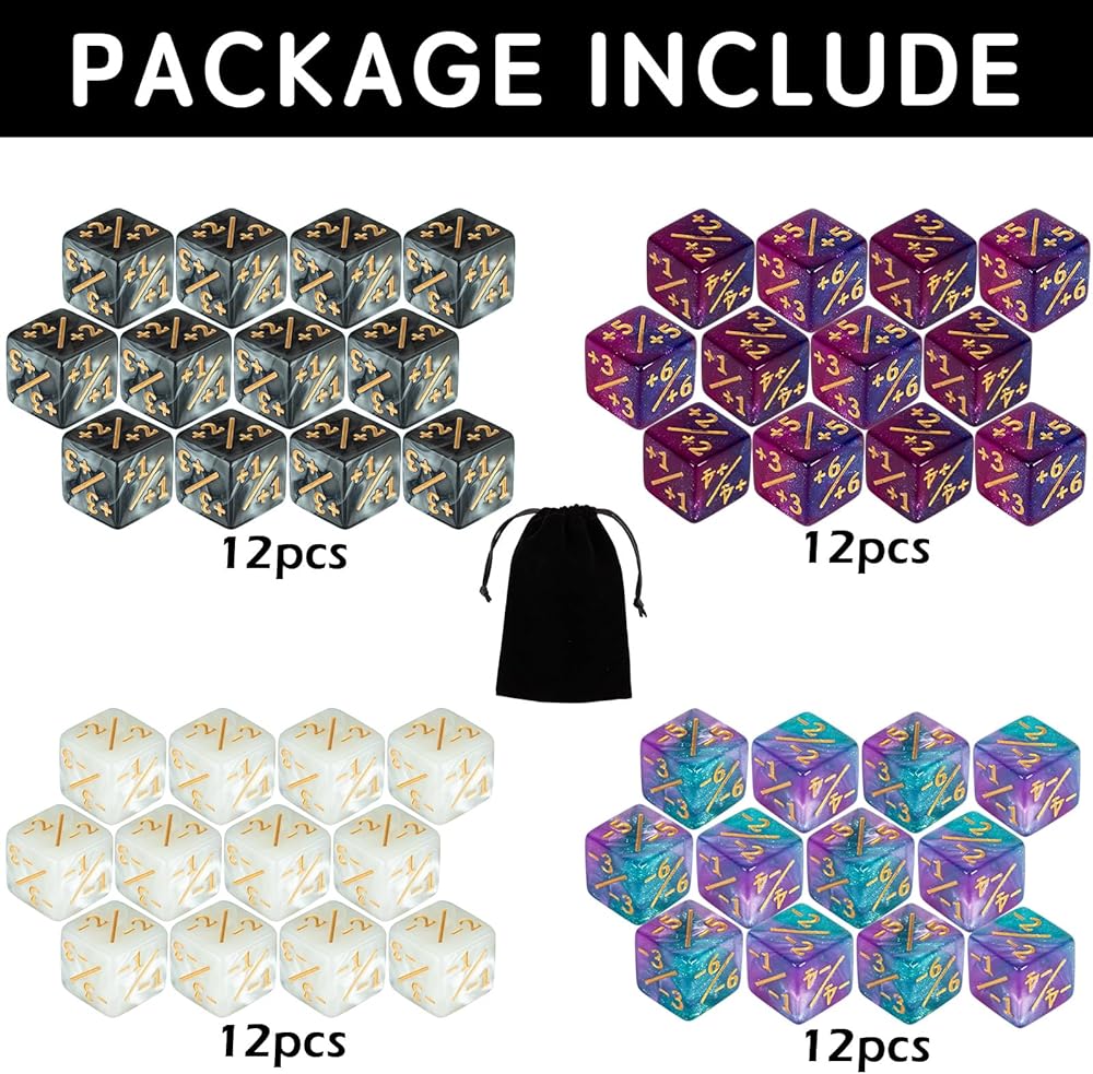 ما ستحصل عليه: إجمالي 48 قطعة من عدادات النرد مع حقيبتين مخمليتين. تتضمن 24 قطعة -1~-6 عدادات النرد و24 قطعة +1~+6 عدادات النرد. هناك 4 ألوان، كما هو موضح في الشكل. يبلغ مقاسها 0.63 بوصة/16 مم نرد D6 عادي.