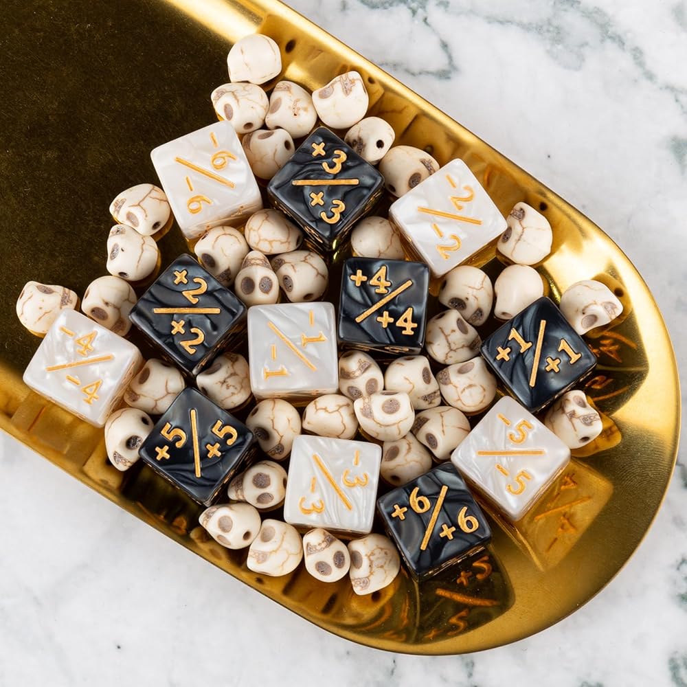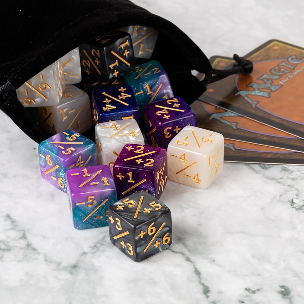 تصميم مبتكر: تصميم مختلط بلونين مختلف جدًا بحيث تكون هذه المجموعة من النرد ملفتة للنظر بشكل خاص. عنصر الألوان المختلطة يجعل كل نرد يبدو فريدًا. يمكن حمل عدادات النرد MTG بسهولة مع حقيبة مخملية.