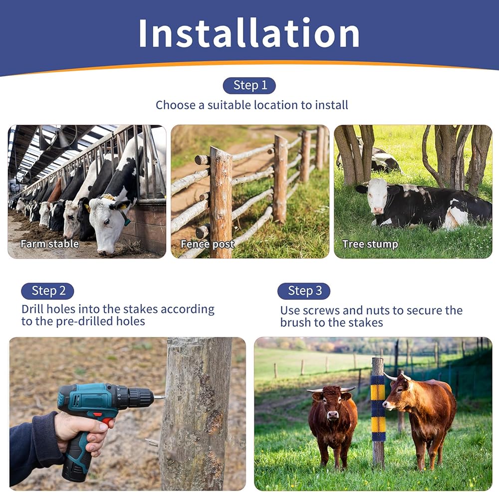 [ EASY TO INSTALL ] The package includes 2pcs livestock scratching brushes and 4 screws. The horse brush can be installed easily on tree stumps, fence posts and other suitable places, to prevent livestock from rubbing against valuable fences, equipment, or buildings.