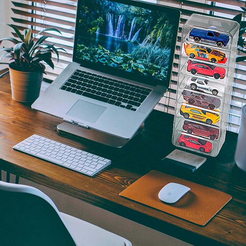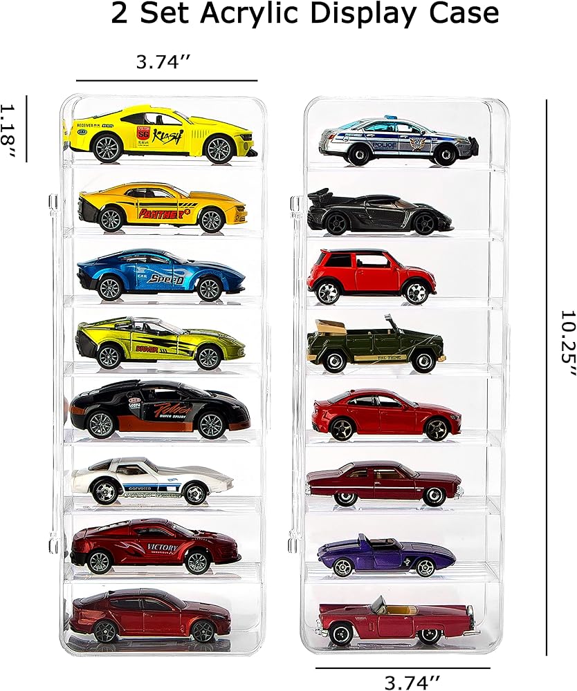 Size: 3.74 x 2.24 x 10.25 inches, each slot's dimension: 3.74 x 2.24 x 1.18 inches, this display case for hot wheels with compact size is great for hot wheels storage.
