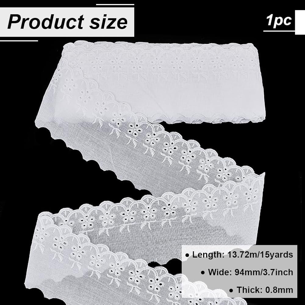 Package & Size: You will receive a roll of 15 yards ivory white cotton lace, about 3.7 inch/95mm wide, 0.5mm thick. The size is sufficient for your daily use and that of your family.