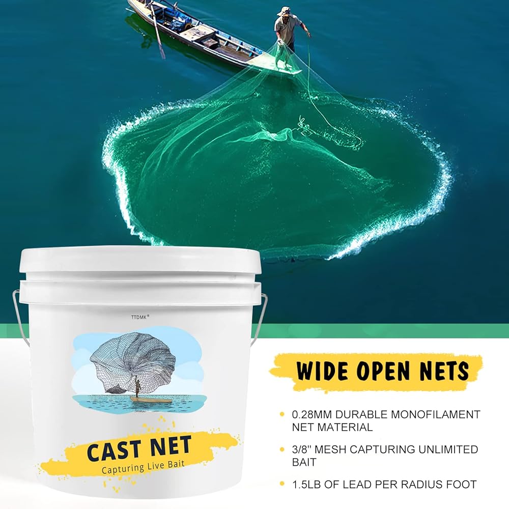 Cast Nets for Fishing with Storage Bucket, Casting Nets for Bait Fish, Freshwater and Saltwater Fishing Nets, 1.5LB/Ft Heavy Duty Sinkers Throw Cast Net, Bait Traps, 3/8 in Mesh Size - by TTDMK