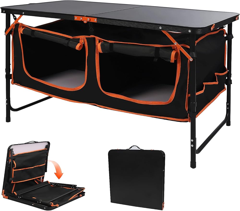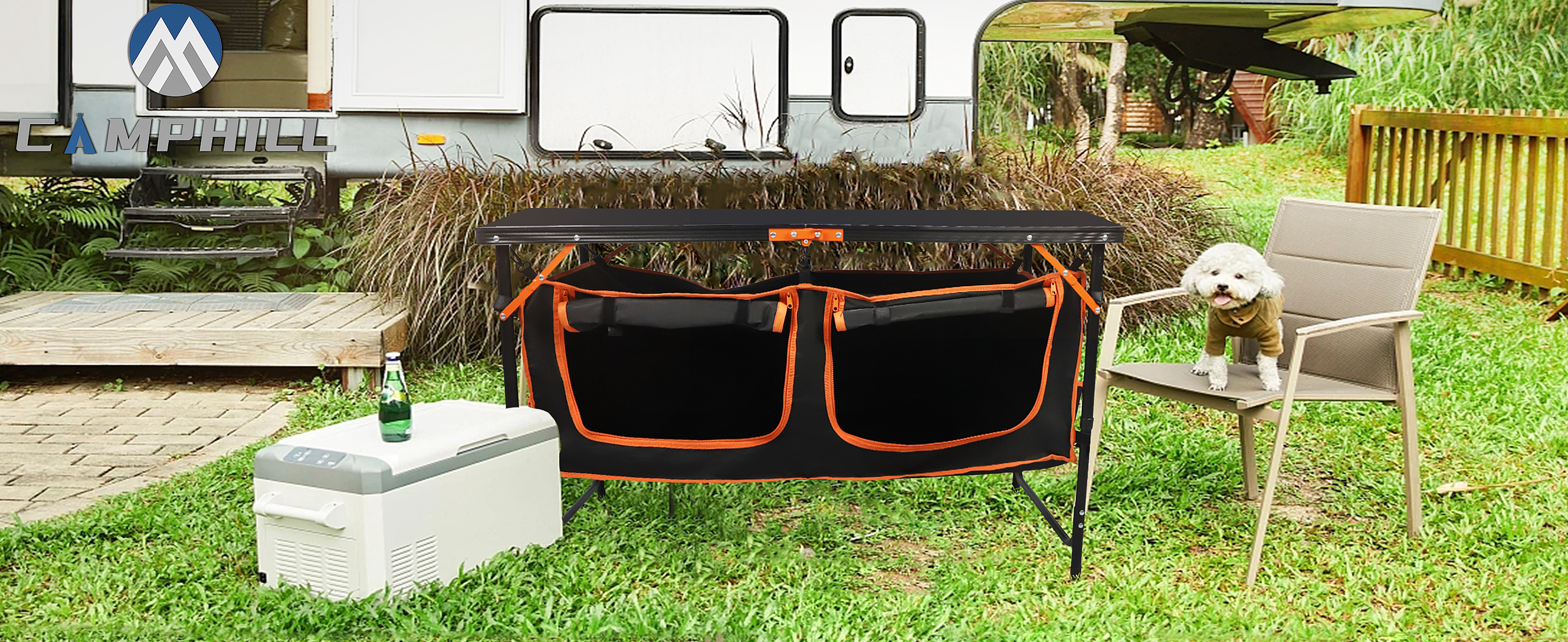 Camping Organizers :CAMPHILL folding camp table take use of 600D high density waterproof oxford which could afford at least 60lbs by test. With velcro and storage canvas.