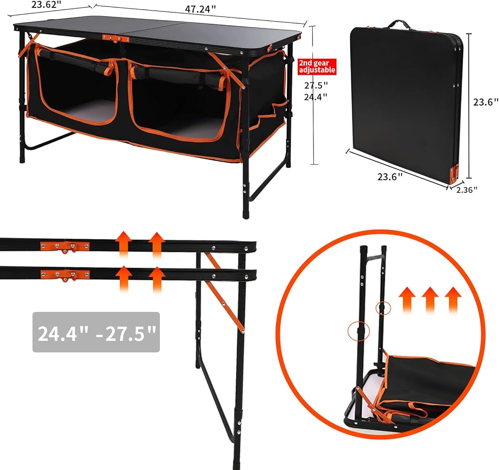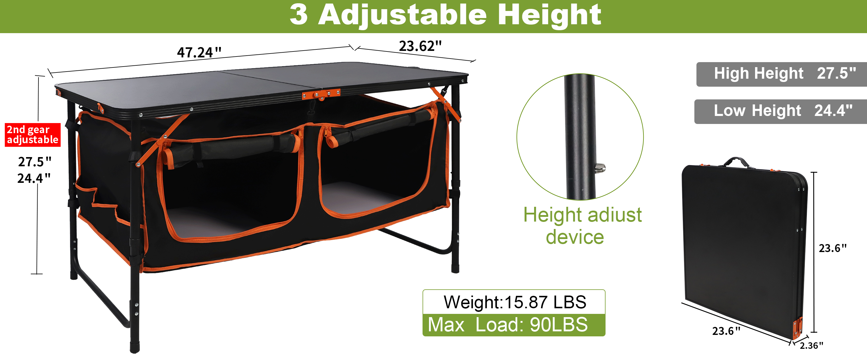 Foldable Table: This convenient camp table folds up easily for storage and transport, 3 levels adjustable legs could lifted from 24.4-27.5 inch. The Oxford camping bag is easy to fold and unfold.