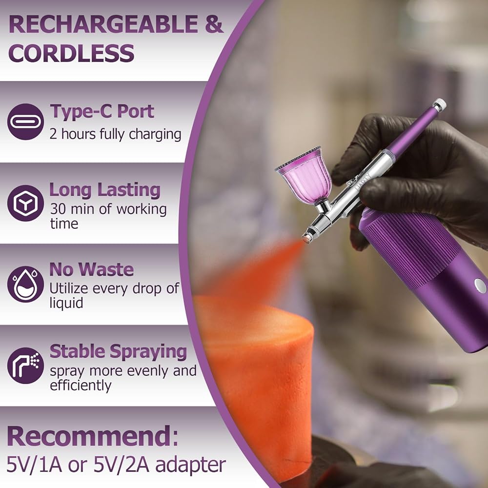 Airbrush Kit Machine with Compressor, Rechargeable Handheld Airbrush, Professional Cordless Air Brush Portable for Nail Art, Makeup, Barber, Cake Decor, Painting (Purple)