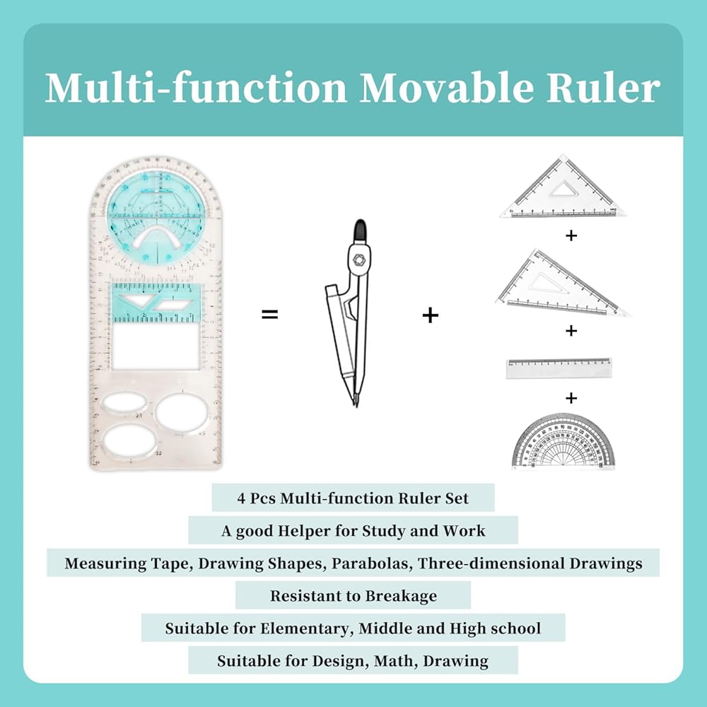 [Rotatable and Movable]: Three semi-oval long rulers have a blue rotatable circular protractor in the top area and a blue removable straightedge in the centre area.The square multifunctional ruler has a rotatable centre area.