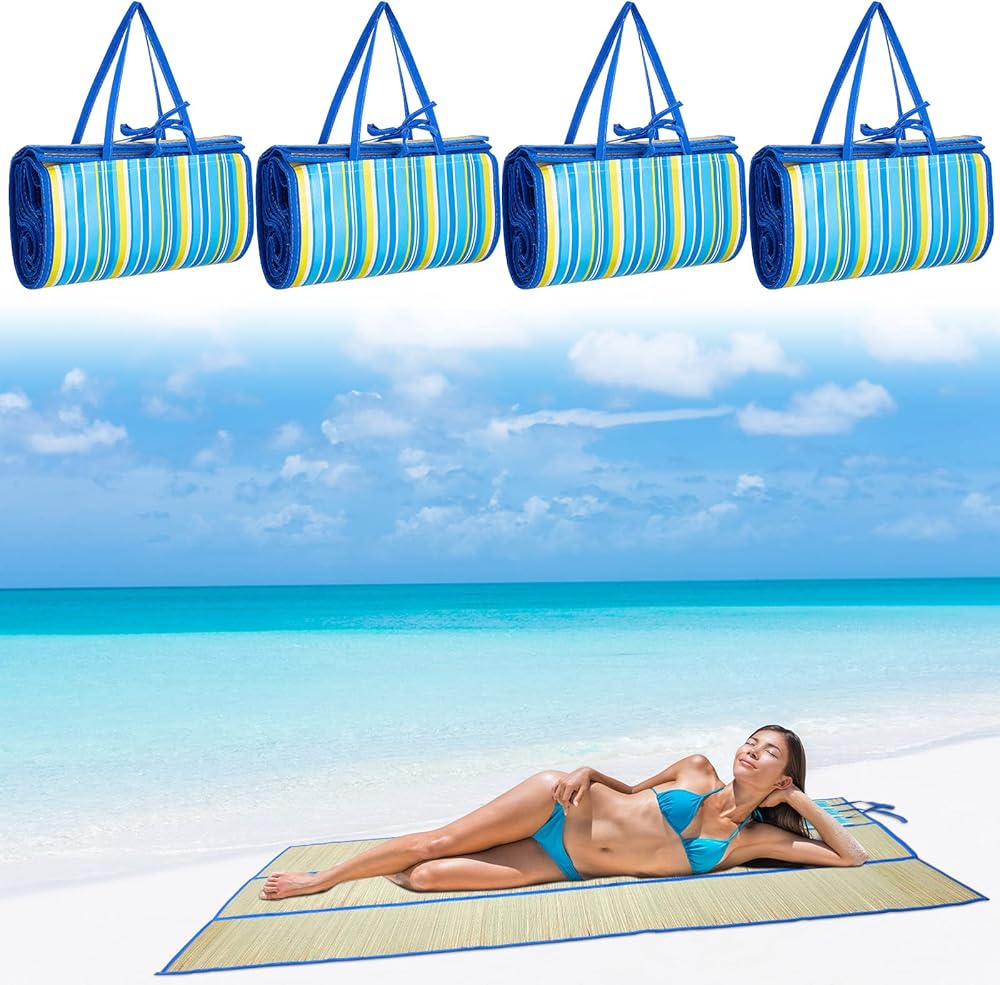 Woanger 4 Pcs Straw Beach Mat Foldable Picnic Blankets 70.8 x 35.4 Inch Portable Sand Proof Beach Blanket Large Lightweight Outdoor Play Mat for Family Gathering Camping Hiking Sunbathing Yoga Park