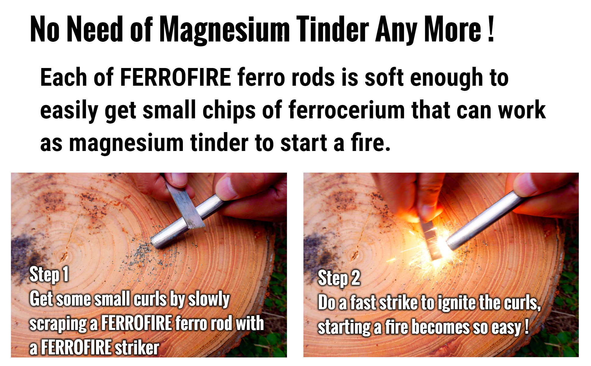 NO MAGNESIUM IN NEED ANY MORE - Each of FERROFIRE Ferro Rods is soft enough to be scraped into small curls of ferrocerium that can work great as magnesium to ignite a camping fire with more ease, you will no longer need to buy magnesium rod as tinder.
