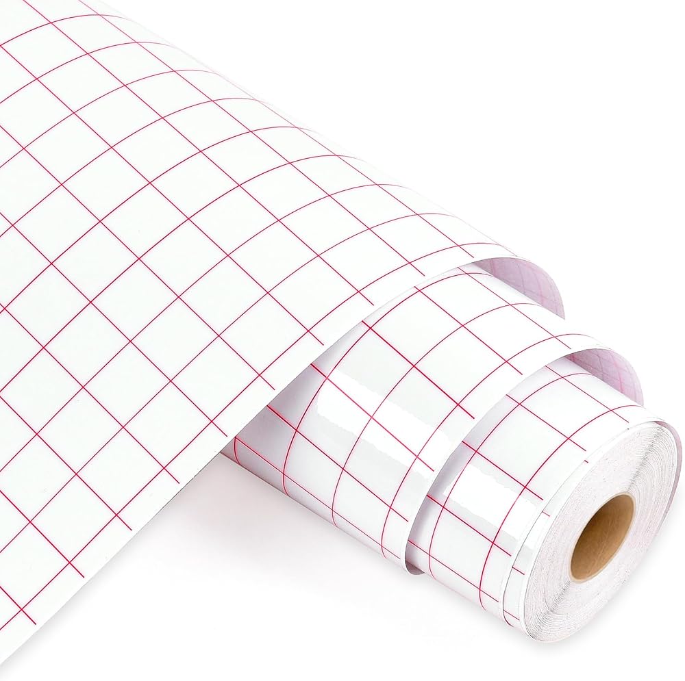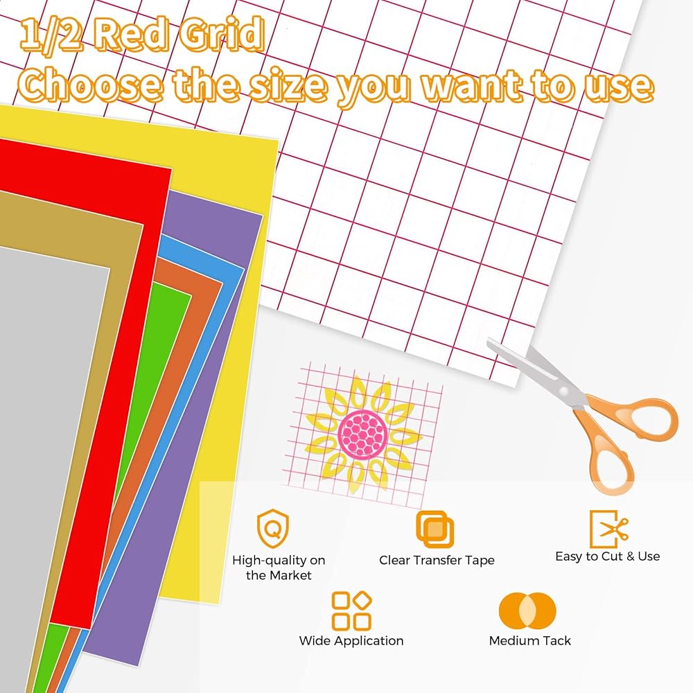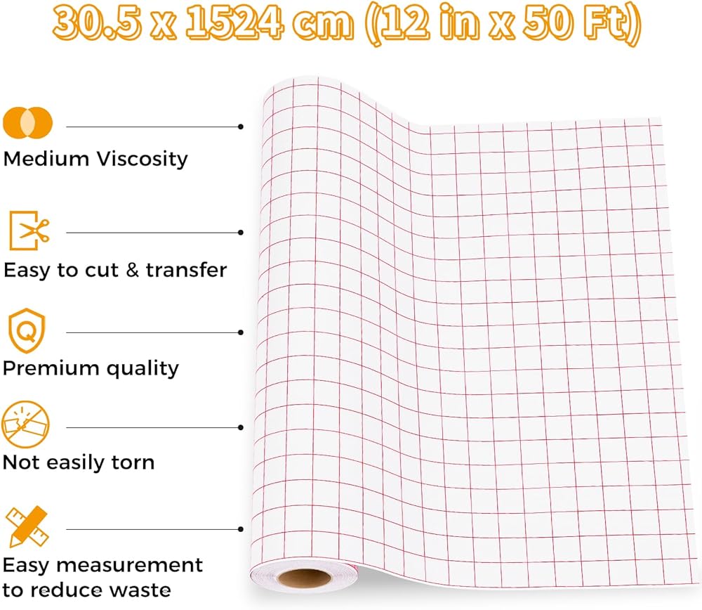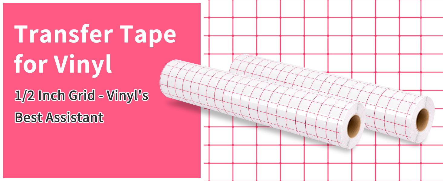 🗞️【CLEAR RED GRID】 12 inch x 50Ft Transfer Tape for Vinyl. The 1/2” red grid lines makes transfer paper easy to measure and cut your transfer paper without waste. Transfer Paper is friendly for beginners.