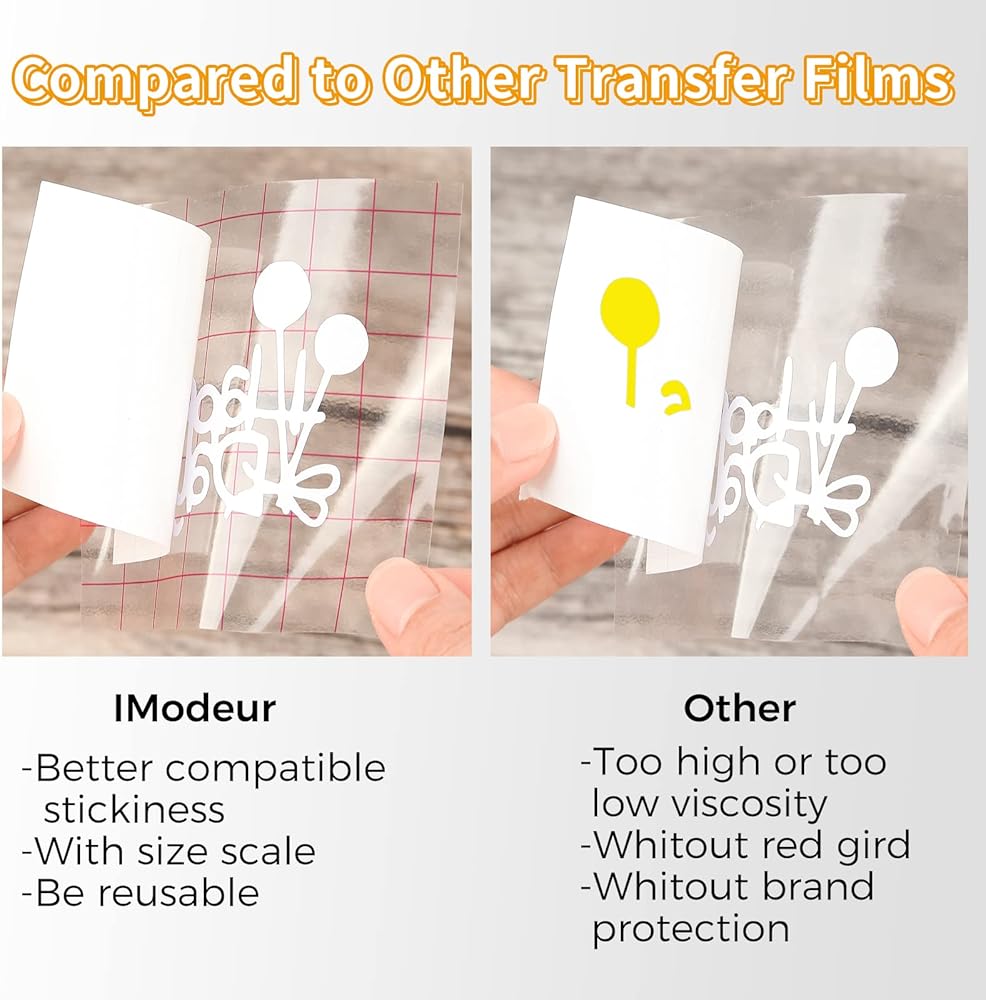 📜【MEDIUM TACK】IModeur Transfer Paper won't be so sticky that you can't transfer your items, but sticky enough to easily lift your project and transfer it to any flat surface. In general, our premium adhesive allows you to reuse the same piece of transfer paper multiple times. Vinyl transfer tape won't leave a sticky residue on vinyl and won't tear your project.