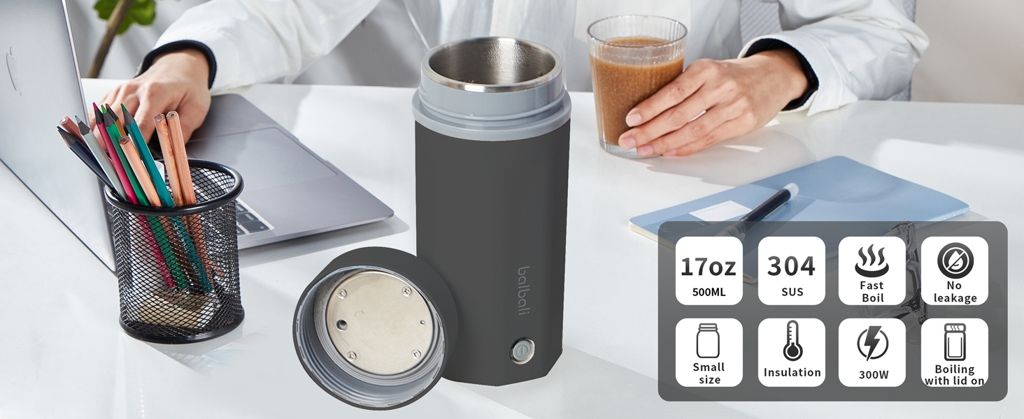 balbali 17oz Travel Kettle Portable Electric Kettle - Mini Hot Water Boiler/Maker/Heater/Warmer for Tea - Small Electric Thermos Heated Travel Mug - Portable Kettle for Travel - Black
