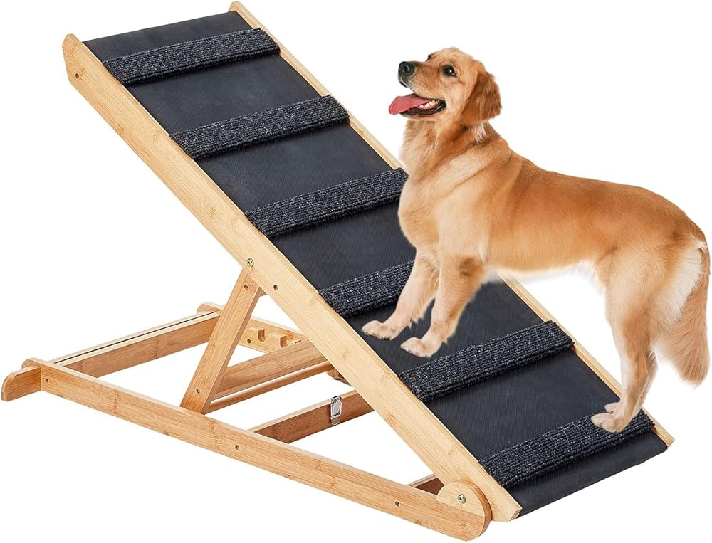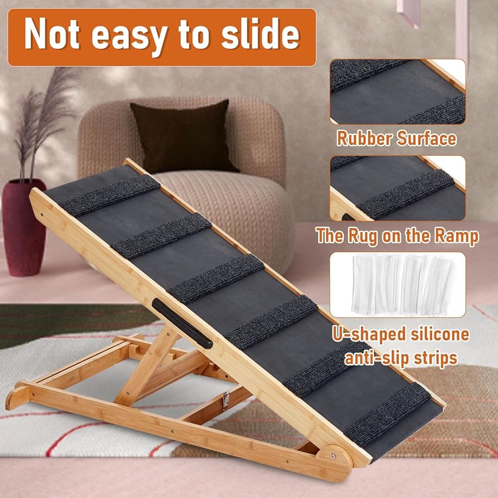 【ANTI-SLIP DESIGN】 - Designed with your pet's safety in mind, our dog ramp for bed features a non-slip surface. It's constructed with scratch-resistant material and incorporates numerous wooden strips, topped with a high-traction rubber carpet with surface grooves. This prevents your pet from slipping and provides peace of mind, especially for older or mobility-challenged pets, making it an ideal gift.