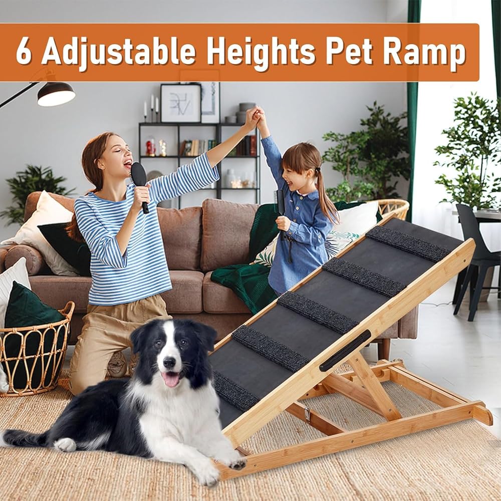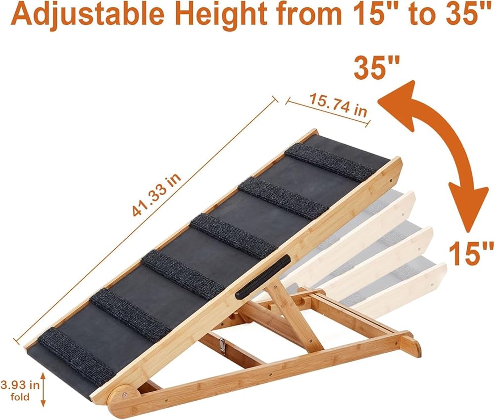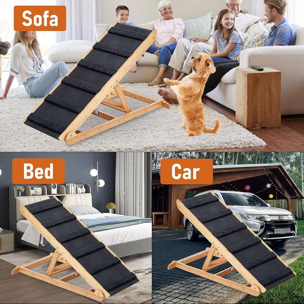 【HEIGHT ADJUSTABILITY】 - Our pet ramp offers versatility with its 6 adjustable height settings: 13.78", 17.71", 19.68", 21.7", 23.62", and 25.59". This feature allows your furry companions to effortlessly access cars, beds, or sofas. Plus, it's a freestanding ramp that doesn't need support from a vehicle or furniture.