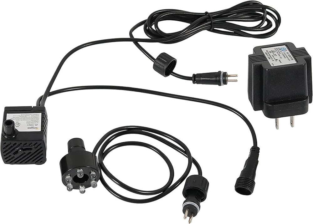 For small fountains and bird baths: The pump measures 1.25" W x 1" D x 1" H and weighs 0.88 pounds. The pump has a flow rate of 40 GPH with up to a 1.6-foot lift. A 32-inch cord connects the lights to the pump.
