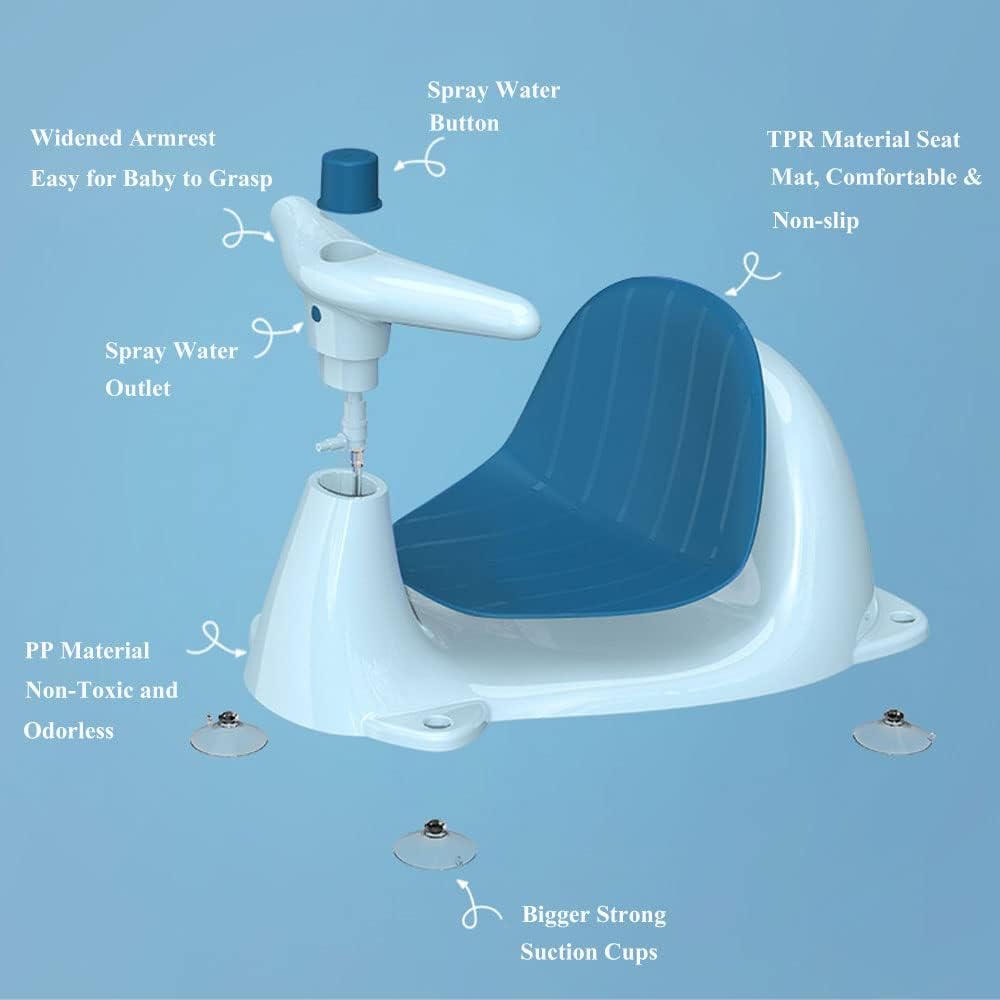 【تصميم رذاذ الماء】يتميز الجزء الأمامي من مقبض مقعد حمام الأطفال بتصميم رذاذ الماء. يمكن للطفل رش الماء من خلال الزر الموجود أعلى المقبض. وفي الوقت نفسه، فهي مجهزة بلعبة رذاذ الماء، والتي يمكن أن تنقل قلق الطفل أثناء الاستحمام، وتجلب المرح للطفل، وتجعل الأم تستحم طفلك بسلاسة.