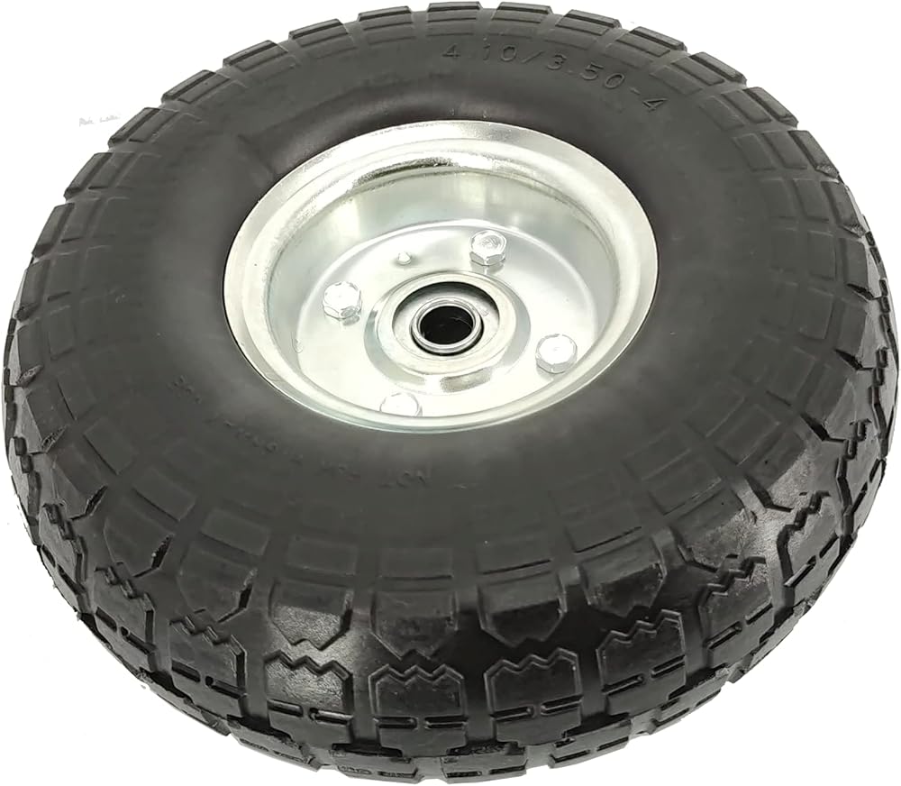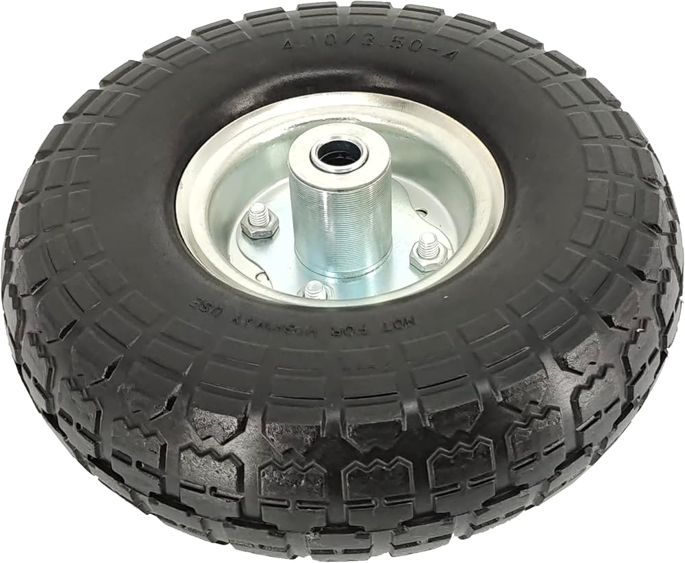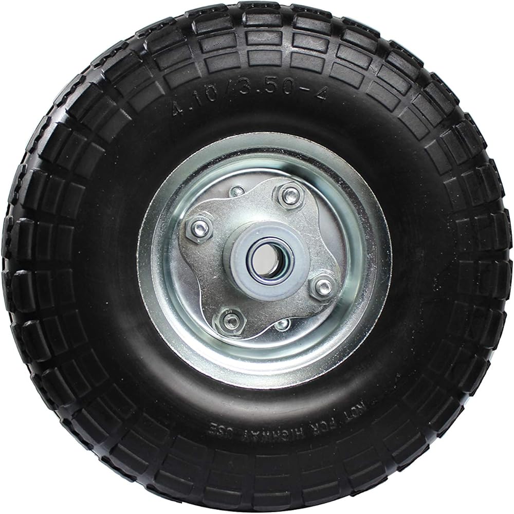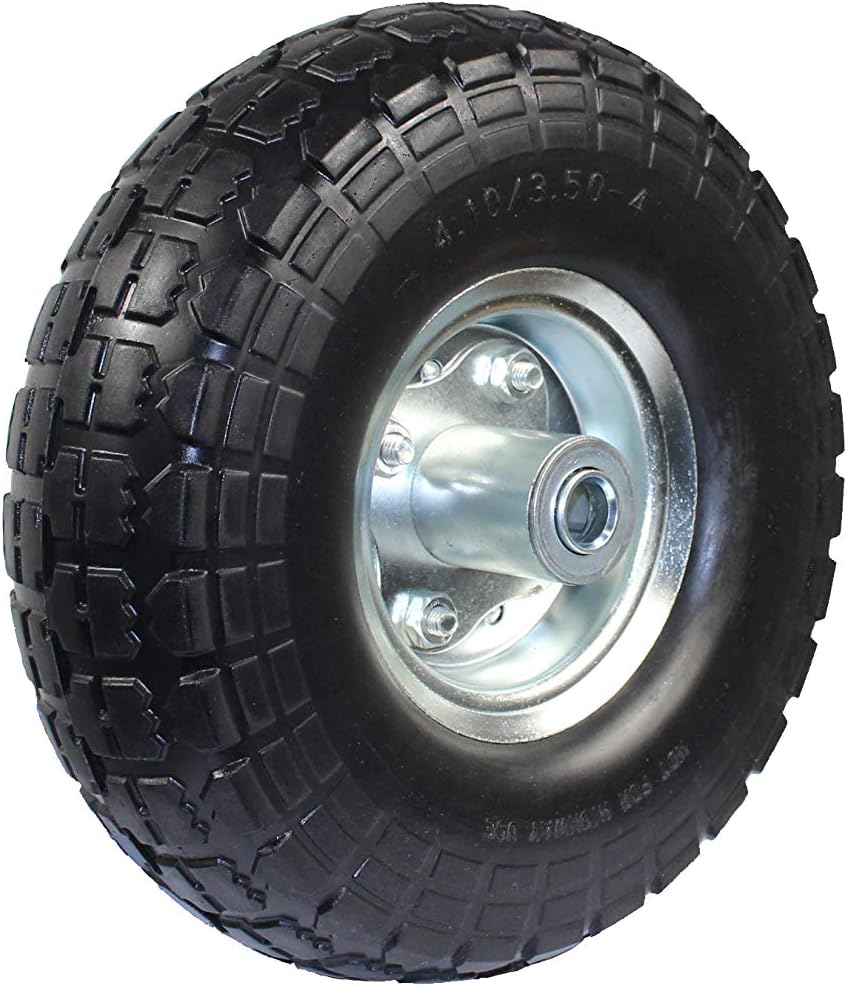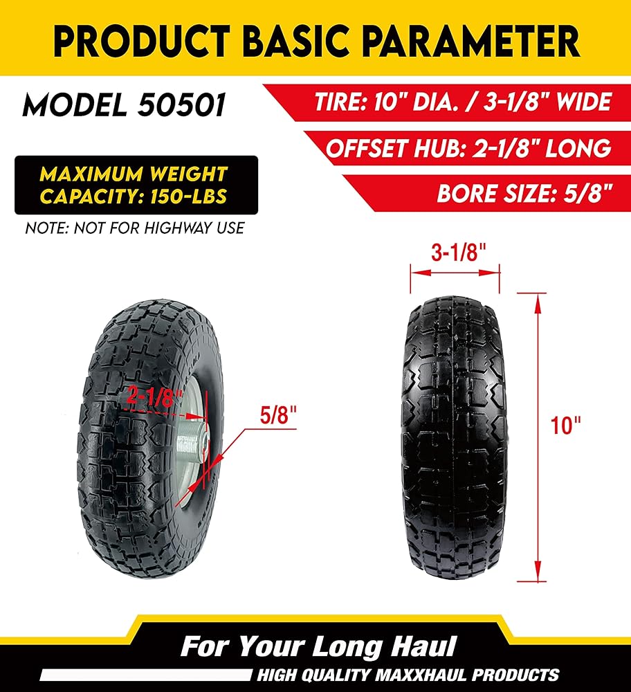 Our MaxxHaul 10" Flat Free Tire is made with high quality, solid rubber to prevent any type of puncture or deflation. It is compatible as replacement tire for garden carts, sack trolleys, and hand trucks. Our tire has a load capacity of 150 pounds and is designed with a sawtooth tread to provide added traction. It measures at 10" and also features heavy duty ball bearings, grease fitting, and a 5/8" axle bore. It also comes pre-mounted on a heavy-duty, steel rim for easy installation.