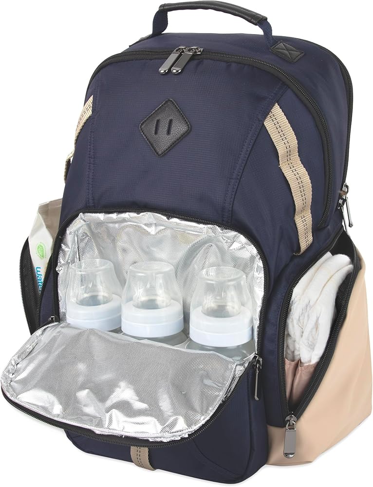 INSULATED COMPARMENT FOR BOTTLES: Diaper bag with insulated front bottle pocket keeps bottles at the perfect temperature. Diaper bag with insulated compartment for sippy cup or other drinks keeps babies & toddlers happy