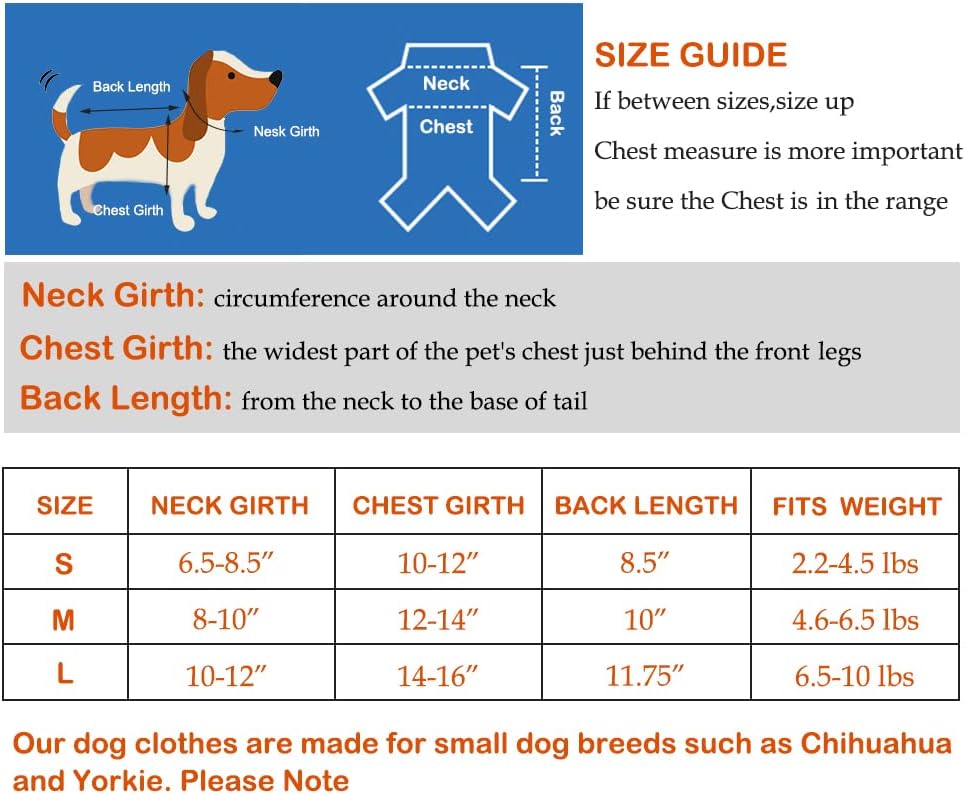 Please follow the size chart: Size XS:-----Neck Girth(5.5"-7.5")--------Chest Girth(8"-10")---------Back Length(7.50")------Fits Dog Weight(1.2-2.2 lbs) Size S:------Neck Girth(6.5"-8.5")--------Chest Girth(10"-12")-------Back Length(8.50")------Fits Dog Weight(2.2-4.5 lbs) Size M:-----Neck Girth(8"-10")----------Chest Girth(12"-14")-------Back Length(10")---------Fits Dog Weight(4.6-6.5 lbs) Size L:------Neck Girth(10"-12")---------Chest Girth(14"-16")-------Back Length(11.75")------Fits Dog Weight(6.5-10 lbs) Size XL:----Neck Girth(12"-14")---------Chest Girth(16"-18")-------Back Length(13.5")------Fits Dog Weight(10-14 lbs) Size XXL:---Neck Girth(14"-16")---------Chest Girth(18"-20")-------Back Length(15")------Fits Dog Weight(12-18 lbs) Our dog clothes are made for small dog breeds such as Chihuahua and Yorkie,Keep your pet dog warmer and more lovely. Please Do Check The Size Chart Before Placing An Order. High Quality, Premium Fabrics, Solid color classic and comfortable hooded sweatshirts with pockets No More Pet Hair Or Dander On Your Furniture! Hair Shedding Is A Common Problem For Pet Owners, This Hooded Dog Sweater Will Help Minimize The Hair Shedding With Our Dog Outfits That Won'T Allow The Hairs To Fall On Your Bed Or Couch Machine Washable In Cold Water Important!!!The sweaters are small in size and are not suitable for large dogs.Mainly For Small Sized Dogs, Doggies, Puppy, Pooches, Such As Chihuahua, Poodle,Cats, Cup Poodle, Pomeranian, Yorshire Terrier, Bichon Frise, Cocker Spaniel, Young French Bulldog, Young Labrador And So On.