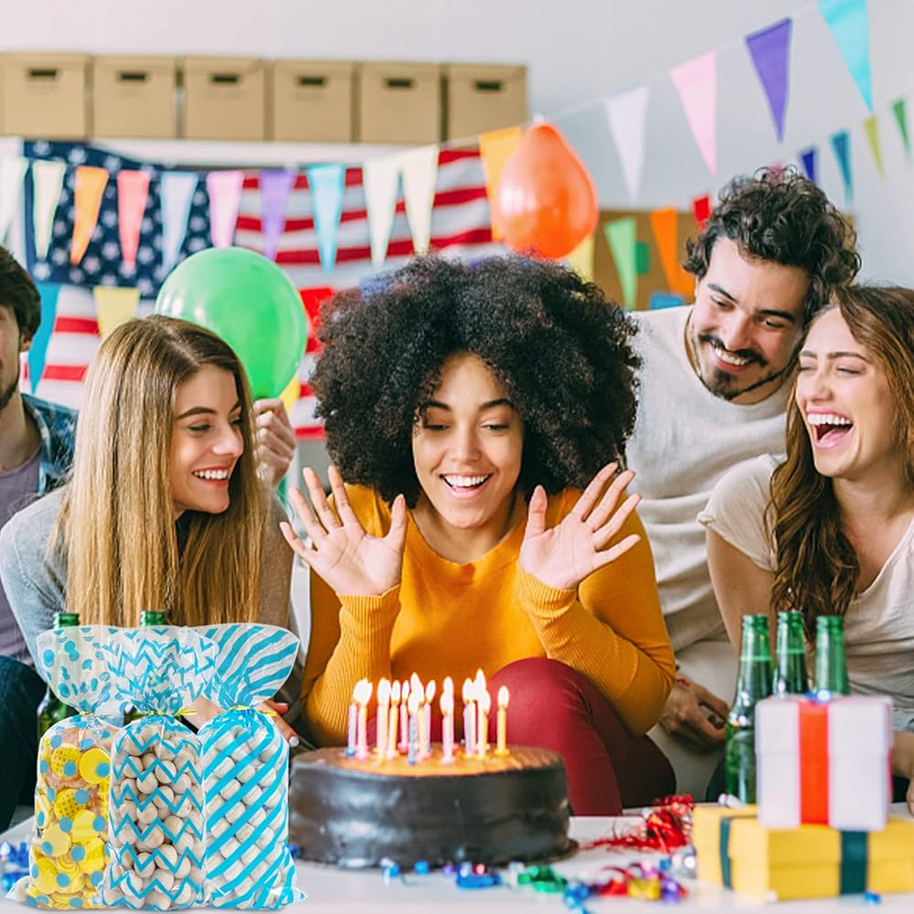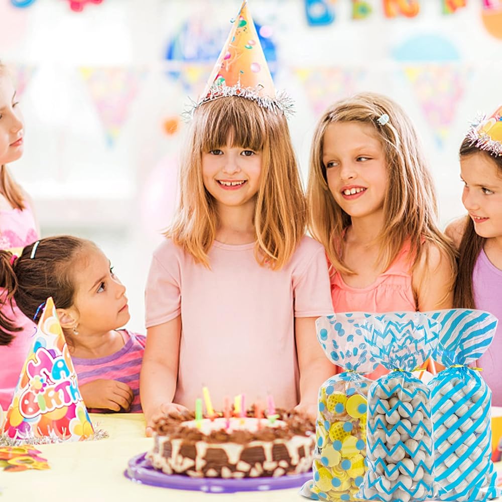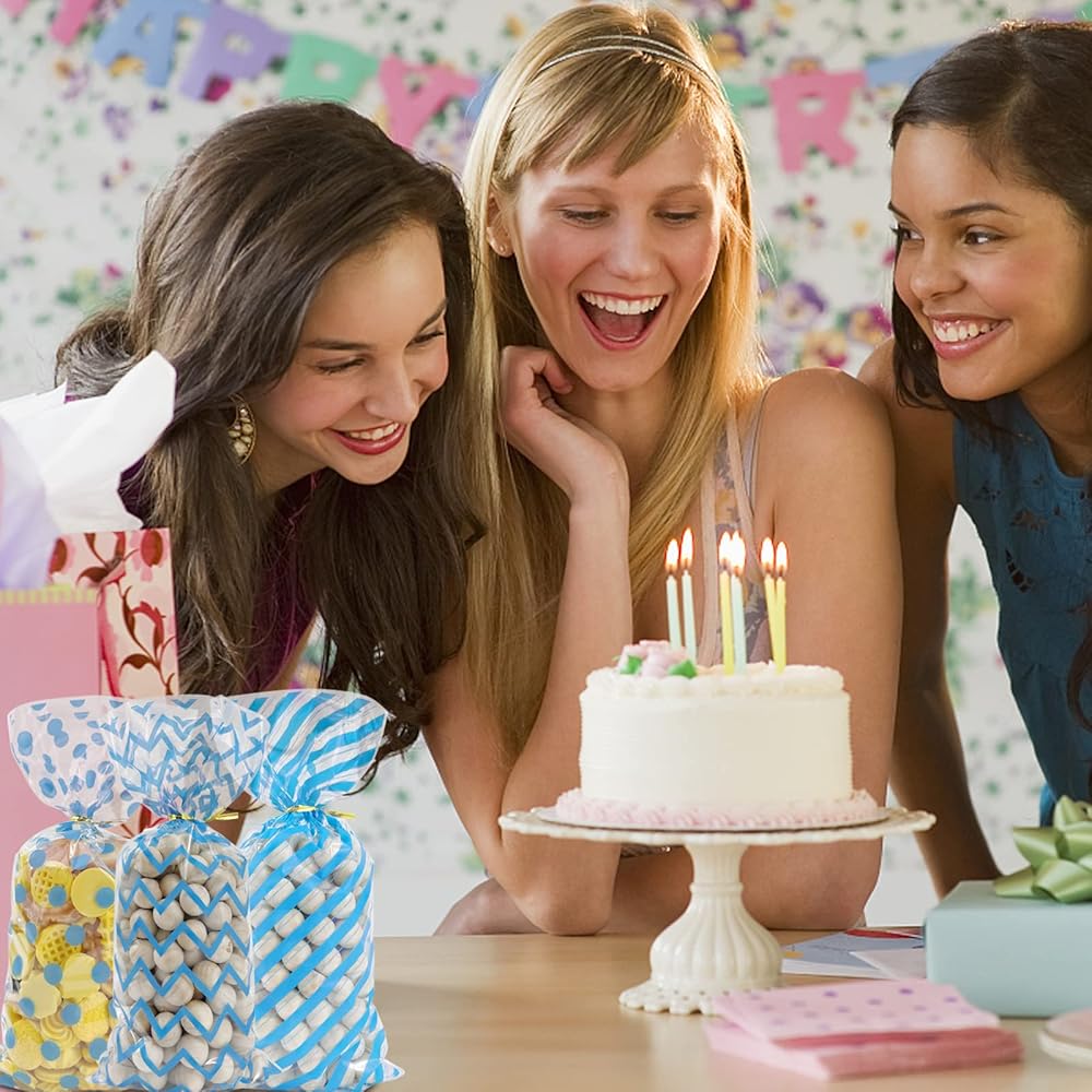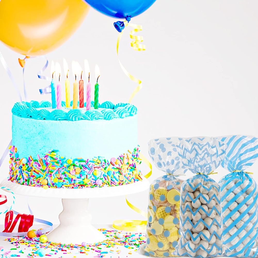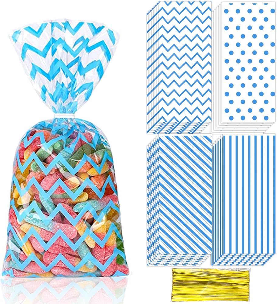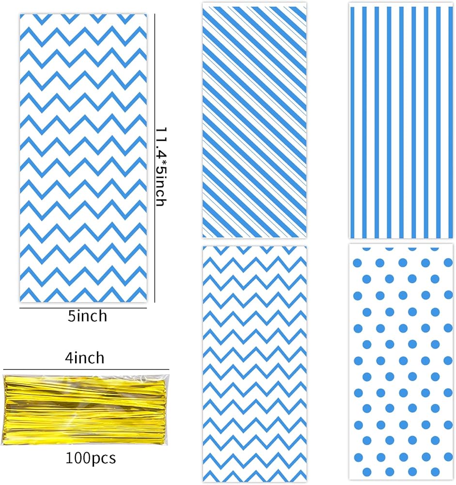 100Pcs Blue Cellophane Bags Baby Shower Candy Bags Gift Bags Treat Bags, Buffalo Polka Dot Stripes Goodie Bags with 100 Gold Twist Ties for Birthday, Baby Showers, Weddings Party Supplies(Blue)