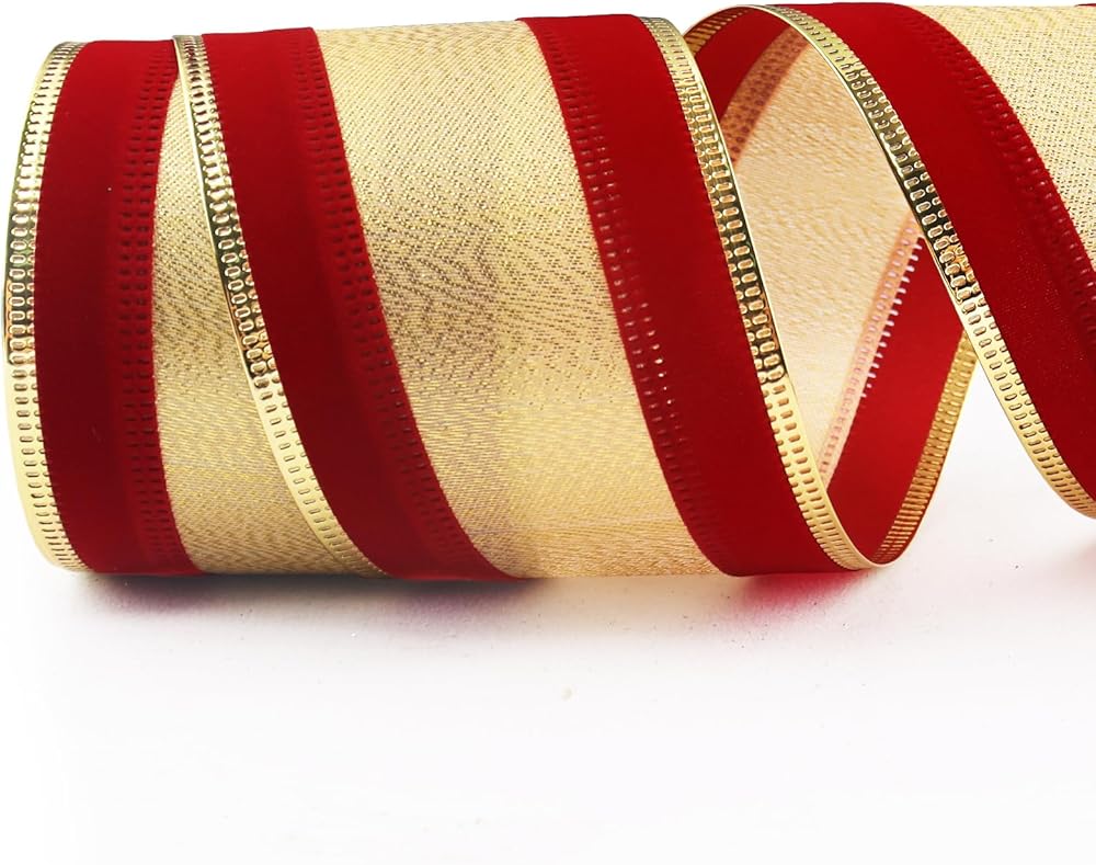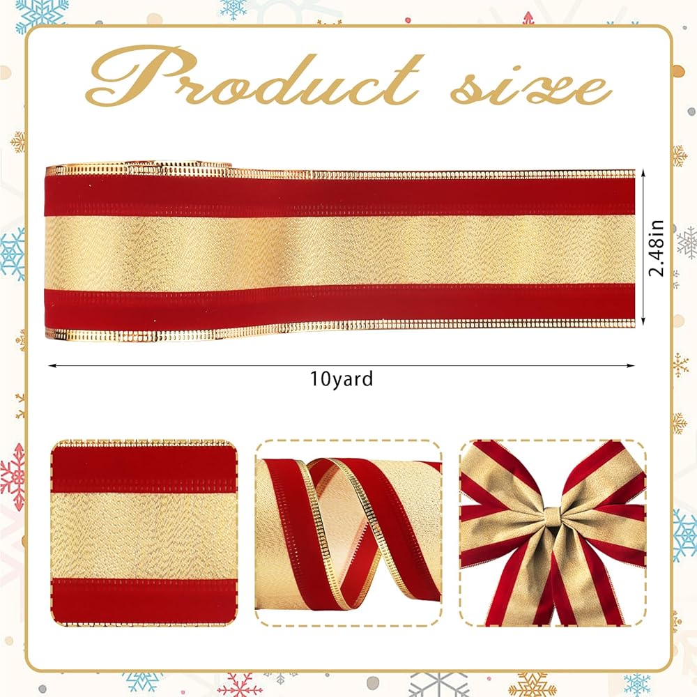 Glodecart Christmas Ribbon for Wreath Bow Wrapping Gift, Velvet Red Gold Edge Ribbon for Gift Wrapping Party Supplies Decoration DIY 2.5" X 10 Yard Wired Winter Christmas Gold Red Velvet Wreath Ribbon