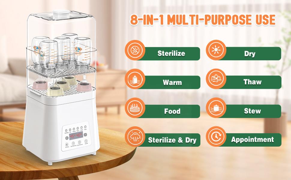 8-in-1 Multi-Purpose Use: This sterilizer does it all - Sterilize, Dry, Warm, Seam, Defrost and More. A one-stop solution for all your baby care needs, making it be a very helpful tool for busy parents.
