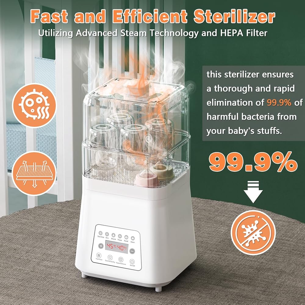 Fast and Efficient Sterilizer: Utilizing advanced Steam Technology and HEPA Filter, this sterilizer ensures a thorough and rapid elimination of 99.9% of harmful bacteria from your baby's bottles, pacifiers, and feeding accessories.