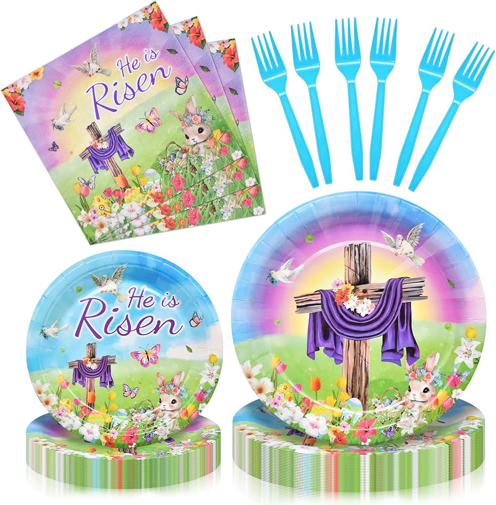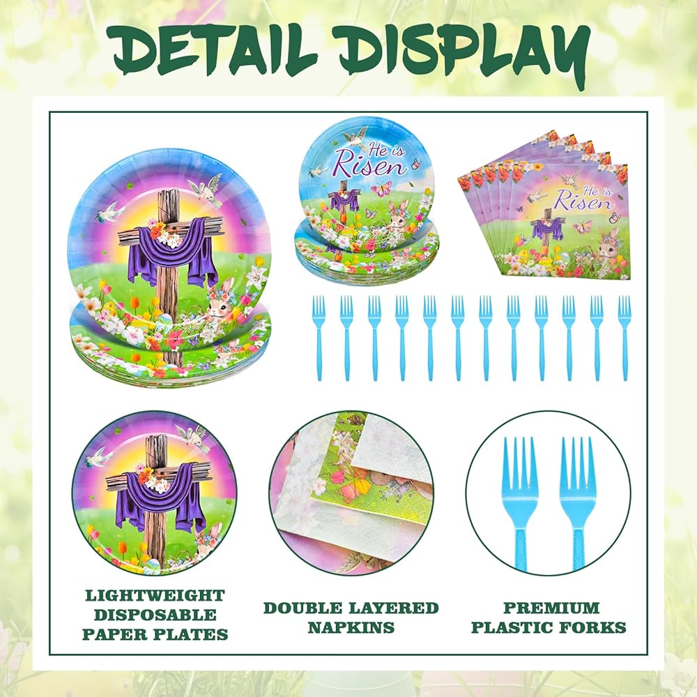 96 Pieces "He is Risen" Easter Day Tableware Set Party Supplies - Religious Theme Disposable Dinnerware with Paper Plates, Napkins, Forks for Spring Resurrection Christian Celebration Favors