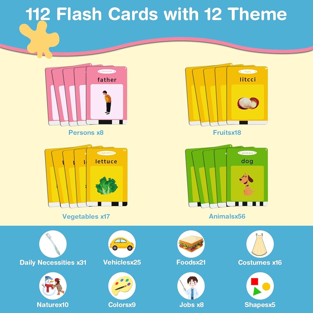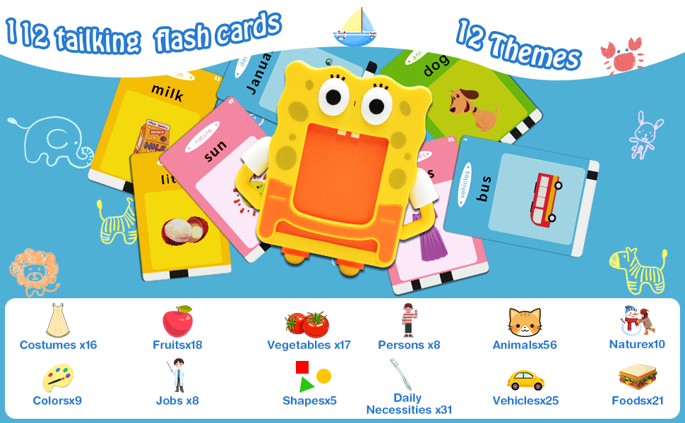 【Toddler Montessori Learning Toys】 The toddler educational talking flash cards reader which attracts children's interests and includes 224 sight words covering 12 subjects . The speech therapy toy teaches kids to learn with Montessori way by all kinds of animals' and vehicles' sounds with a lot of fun and interests.