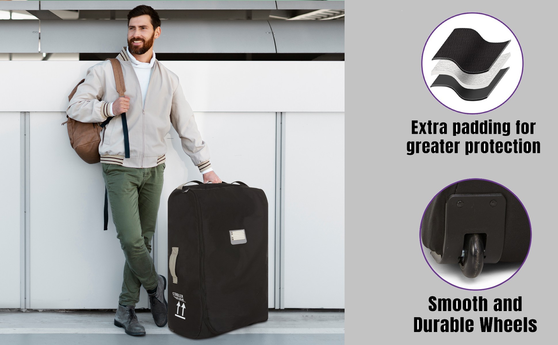 [EASY TO CARRY] – Experience smooth travels with our travel bag, featuring easy-rolling wheels and a comfortable handle. These elements guarantee a seamless and enjoyable journey, ensuring that your stroller glides effortlessly wherever you go.