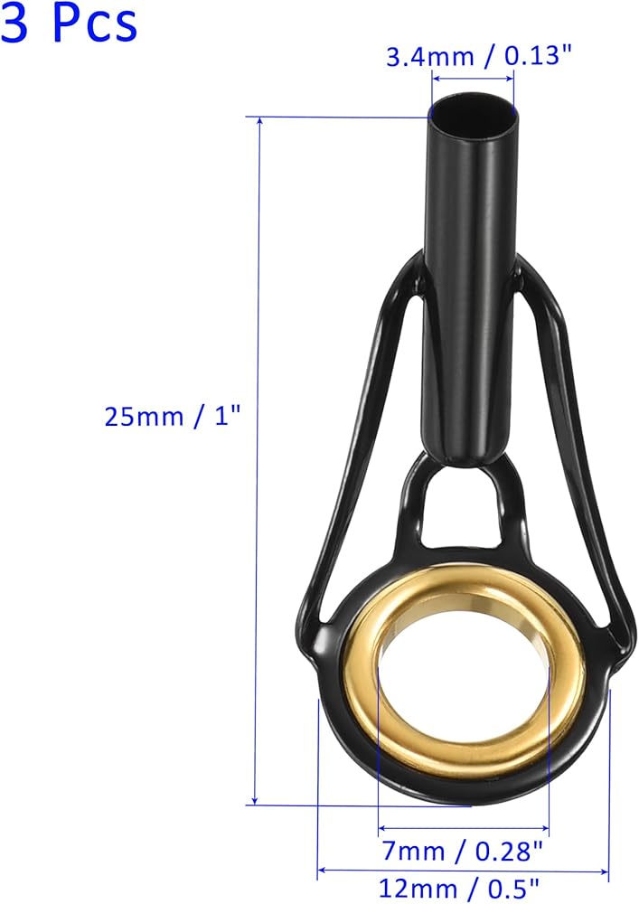 PACKAGE INCLUDE: 3 Pack of Fishing Rod Tips, which size is Ring Inner Diameter: 7mm / 0.3 inch, Ring Outer Diameter: 12mm / 0.5 inch, Tube Inner Diameter: 3.4mm / 0.13 inch, Overall Length: 25mm / 1 inch, Material: Stainless Steel.