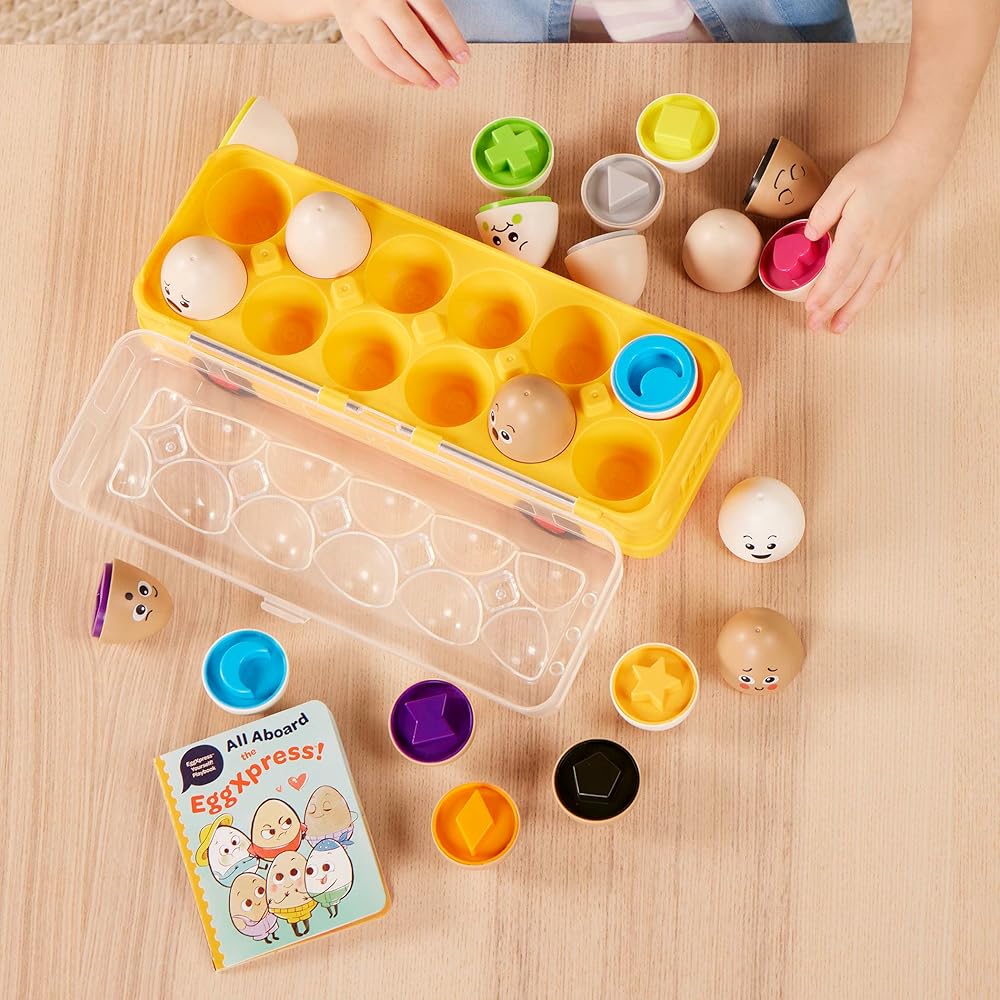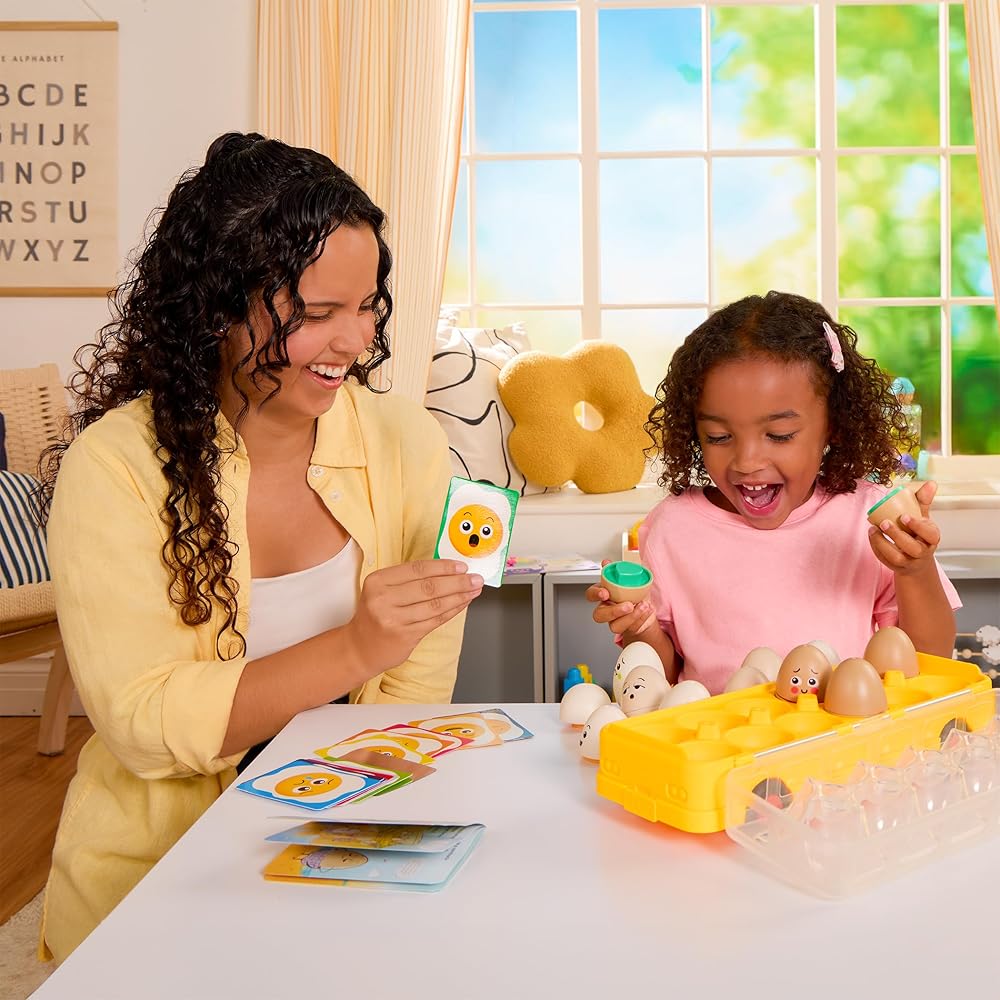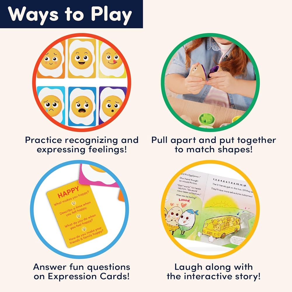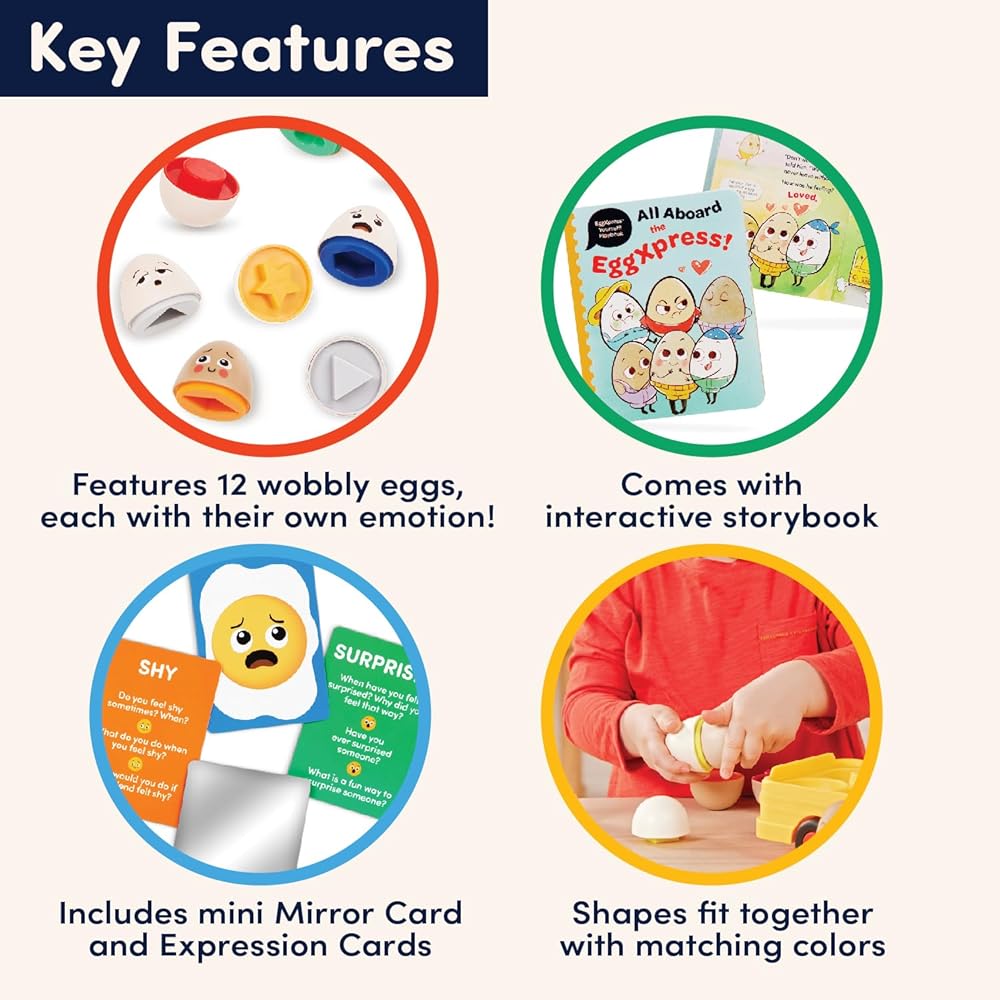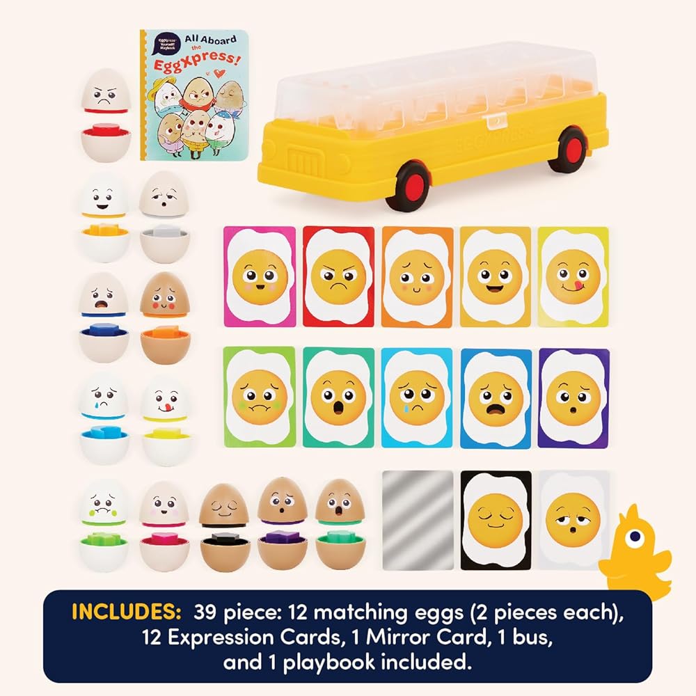 - 39-Piece Set: Match, learn, reflect, and express with matching eggs, Expression Cards, a Mirror Card, and a toy bus