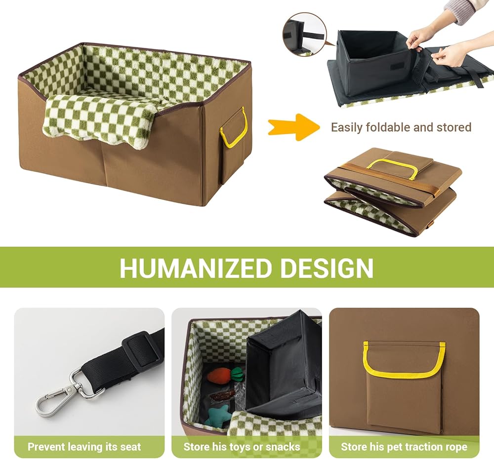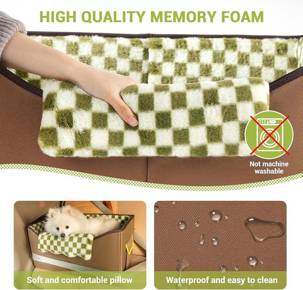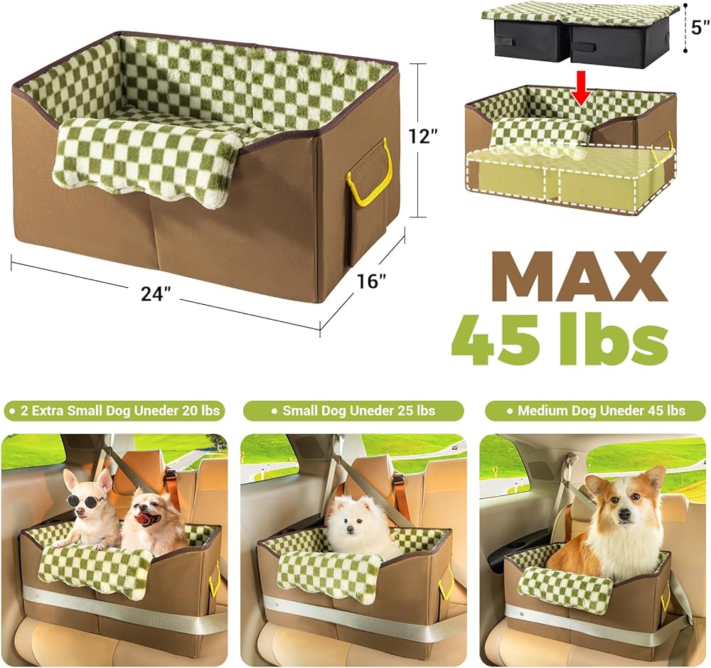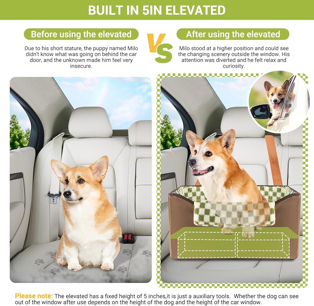 مقعد سيارة مرتفع للكلاب متوسطة الحجم يقل وزنها عن 45 رطلاً أو كلبين يقل وزنهما عن 25 رطلاً، مقعد معزز للحيوانات الأليفة على شكل دلو للمقعد الأمامي والخلفي لرؤية النافذة، مقعد سيارة على شكل سرير كلب غامض مضحك (بني داكن + أخضر منقوش)