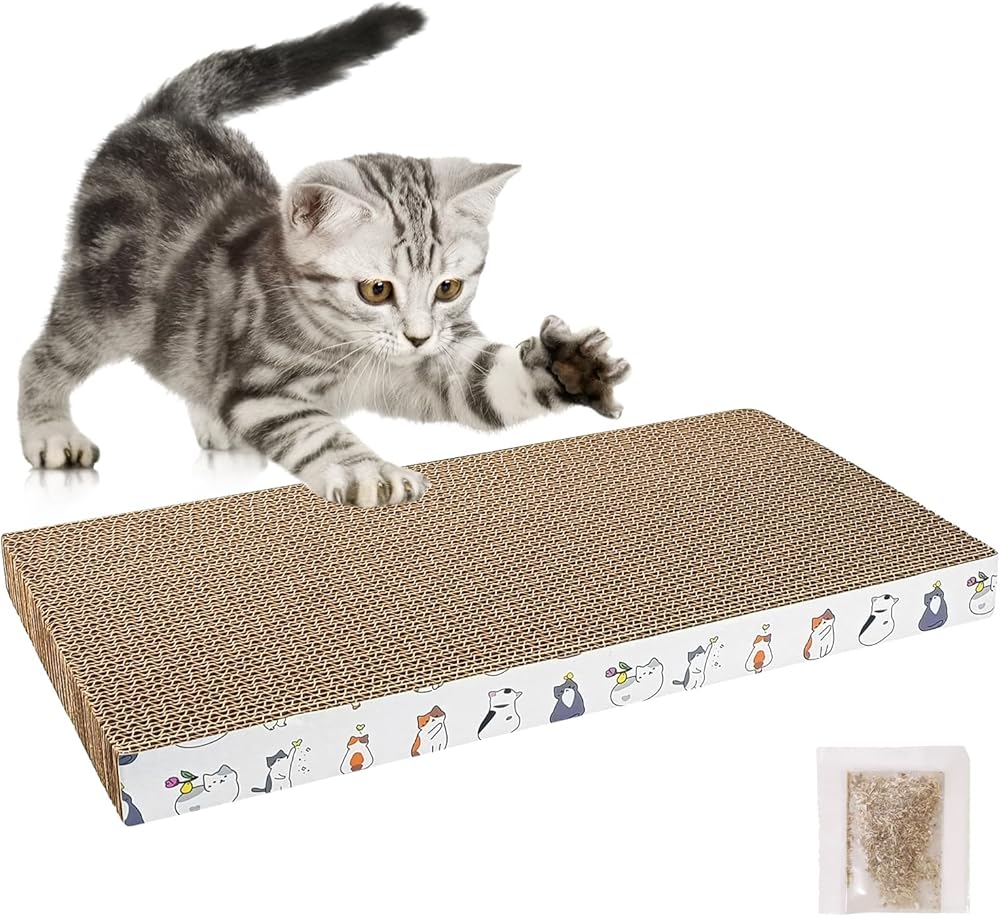 Application: This cat cardboard is mainly used to make cat's life more interesting, suitable for cat to grind claws and relax. It also helps the cat to comb and trim its paws every day, consume energy, ease its scratching desire, and keep away from furniture such as sofa and carpet. Most cats fit this size.