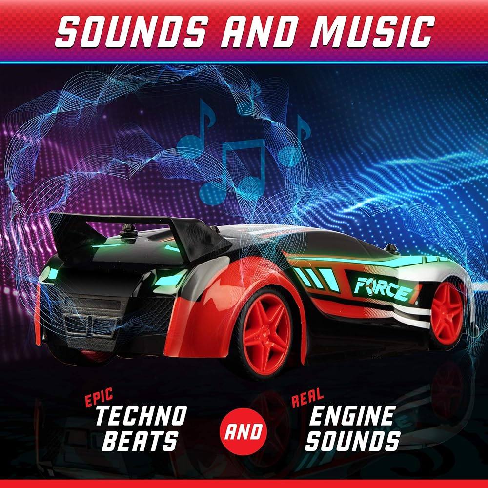 أصوات المحرك والموسيقى: سيارة Techno Racer RC هي سيارة عن بعد عالية السرعة تعمل بمصابيح LED وامضة ساطعة وموسيقى تكنو ملحمية؛ سيارة السباق الداخلية متوفرة بلونين مختلفين: الأحمر والأزرق؛ مقاس 8.5 بوصة طول × 3.5 بوصة عرض × 2.25 بوصة ارتفاع