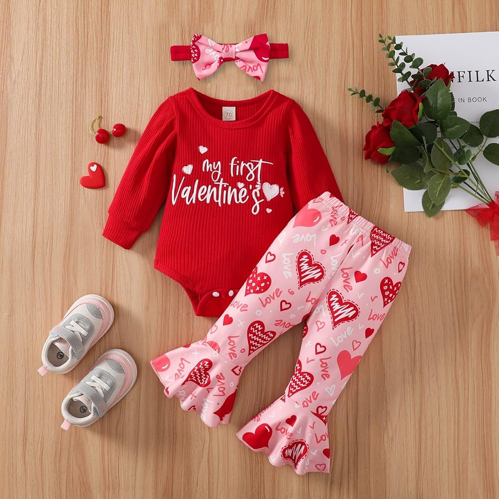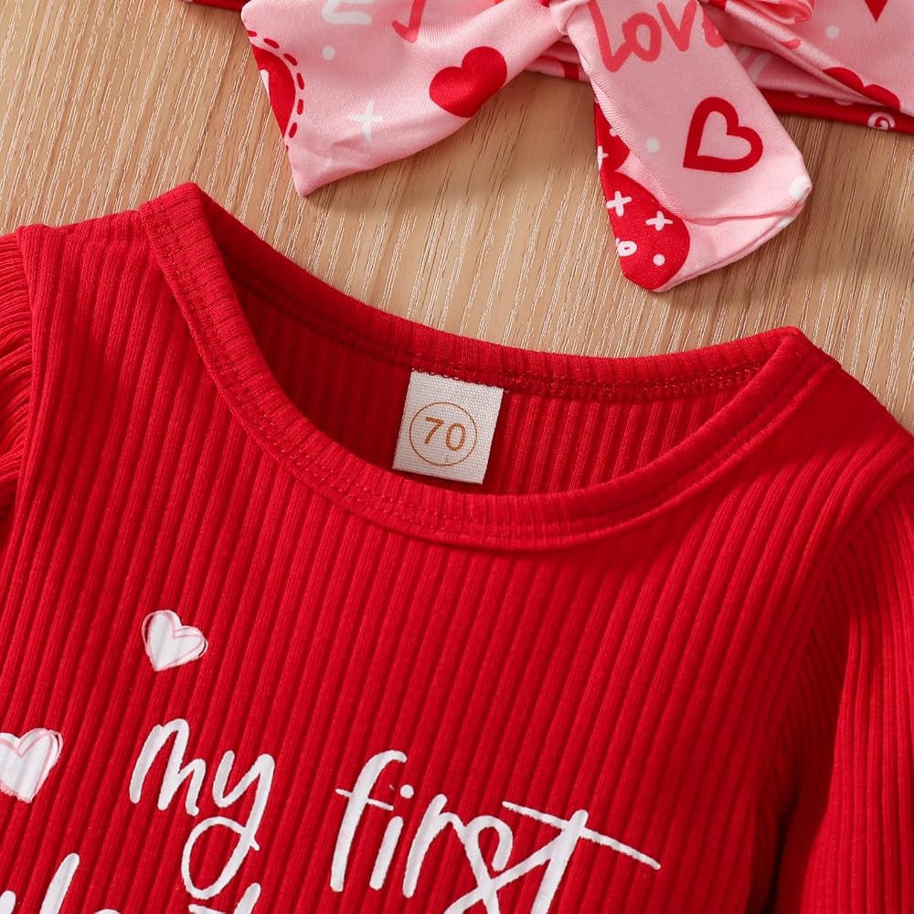 Style: Cute newborn baby girl Valentine's Day outfits, long sleeve ribbed round neck romper top, My First Valentine's Day letter printed bodysuit playsuit, matching love letter and heart print Bell-Bottom leggings pants, perfect little girls Valentine's Day clothes set