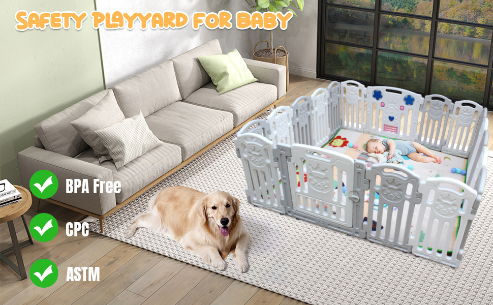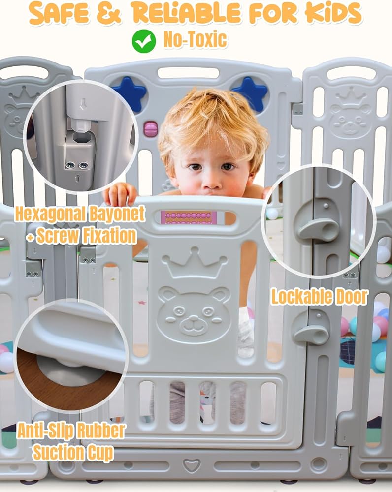 【Solid Support】For stable use by babies, playpen each panel comes with anti-slip rubber suction cups at the bottom to prevent tipping and shifting. Additionally, the baby playpen features an external door lock, eliminating concerns about your child venturing out of the playpen.