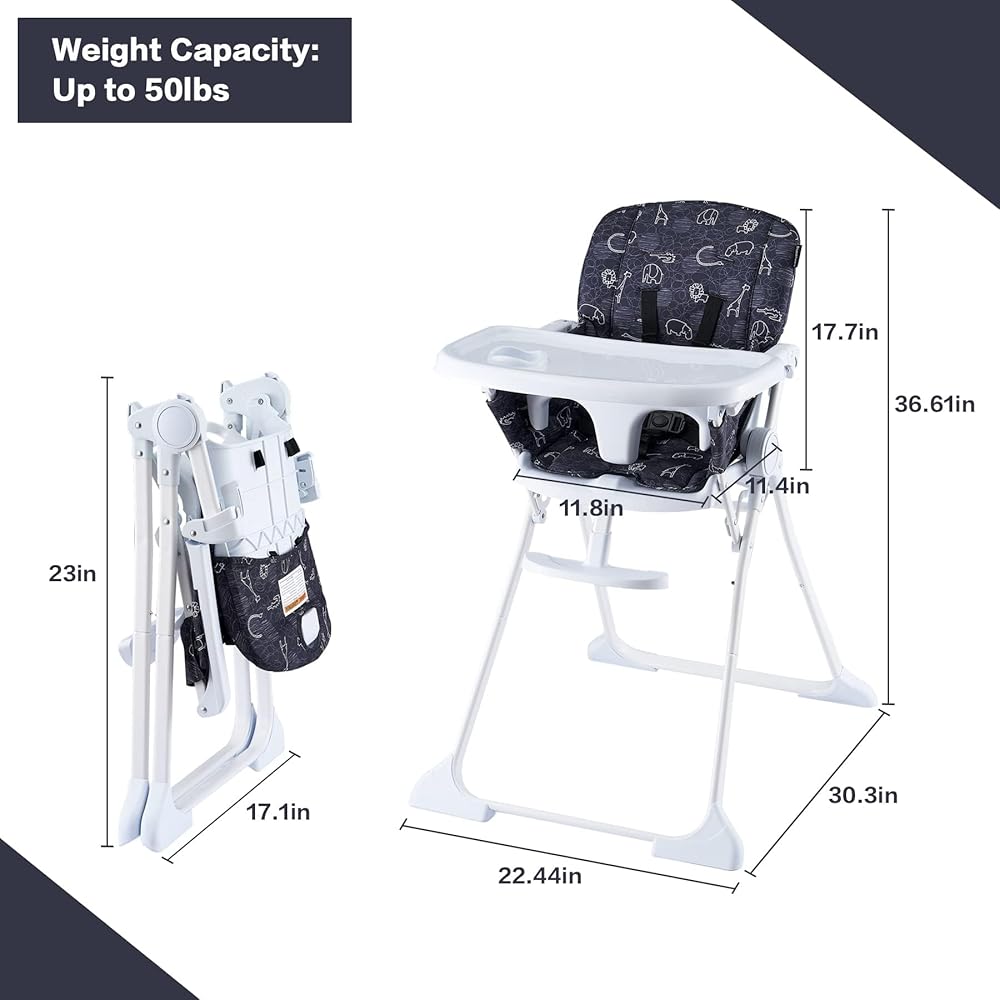 - Ultra-slim folding high chair is designed to fit in compact spaces