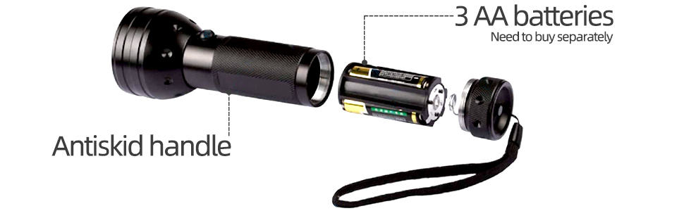 - [BATTERY TYPE]: The UV Flashlight is battery operated, requires 3 AA Batteries (not included in the package).