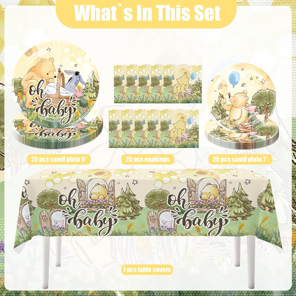 【bear theme baby shower decoration package includes】: 76 pcs pooh bear baby shower decorations tableware set includes 25pc 9" disposable bear plates, 25 pc 7"disposable bear plates, 25 pcs napkins, 1pc tablecloth. this bear-themed baby shower tableware set will make your baby shower decorations party funnier.