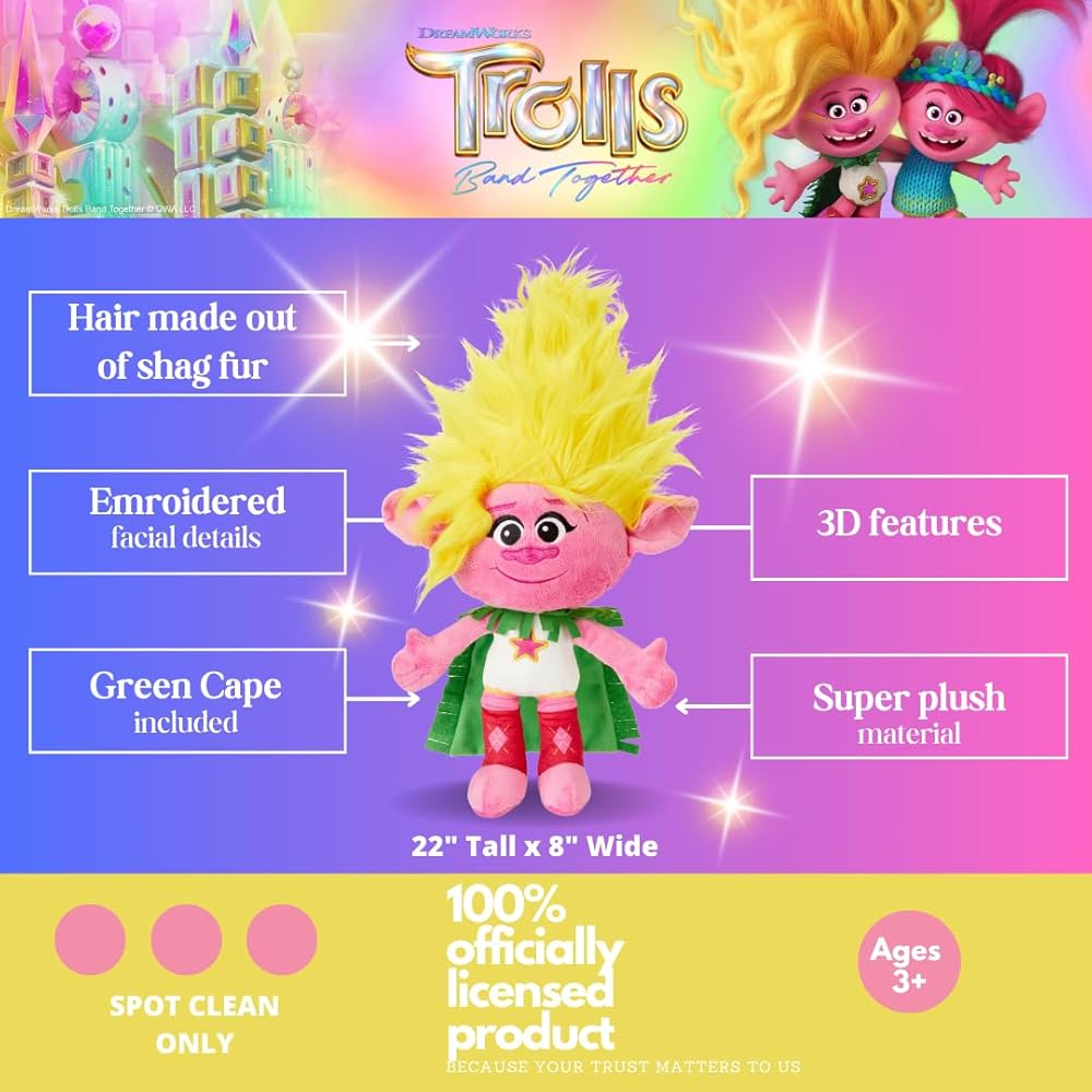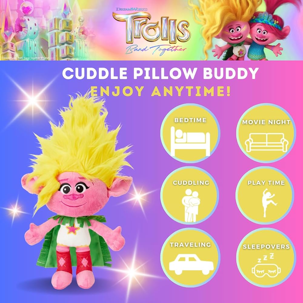 FUN AND CUDDLY: This cuddle pillow brings Sister Viva to life with fun embroidered face details and dimensional fluffy hair like the character from the popular Trolls 3 movie. A great travel accessory for use in home, car, camping and sleepovers for napping and cuddling.