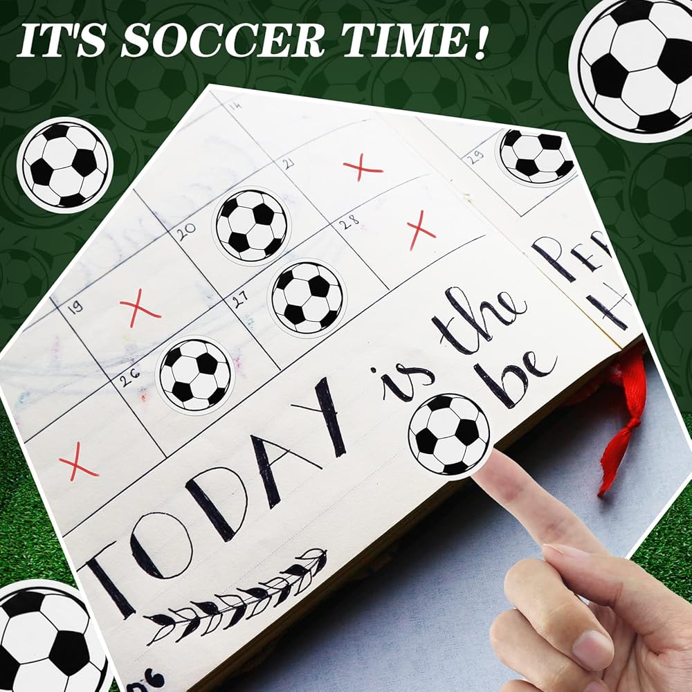 التقويم - ملصقات كرة القدم بقطر 1.18 بوصة (3 سم) مثالية للالتصاق بسجلات القصاصات والتقويمات والجداول الزمنية، بالإضافة إلى ملصقات المكافآت للأطفال، ولا تفوت أي وقت من مباريات كرة القدم أيضًا