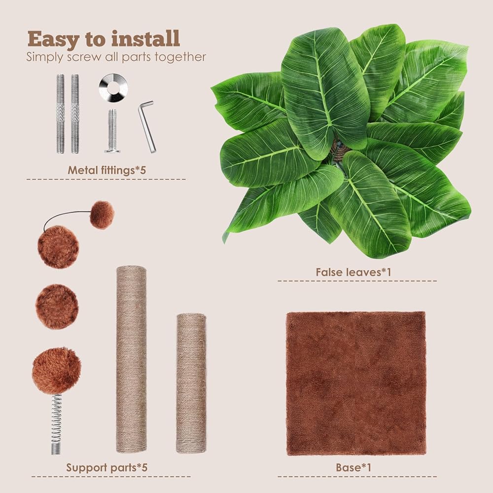 🌴[Easy Assemble]: No need to assemble the sisal rope and the leaves by yourself when you receive the package because they have already been fixed on the post. And the simple construction with 3 posts and 1 base can be assembled by the screws that included in the package. It is very easy to assemble, you can finish it in several minutes.