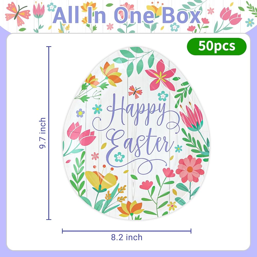 Easter Paper Plates 50 pcs Easter Egg Shaped Disposable Plates with Spring Flowers Easter Paper Dessert Plates for kids Easter Holiday Spring Party Plates Disposable Easter Egg Plates 9.2 X 8.2 inch